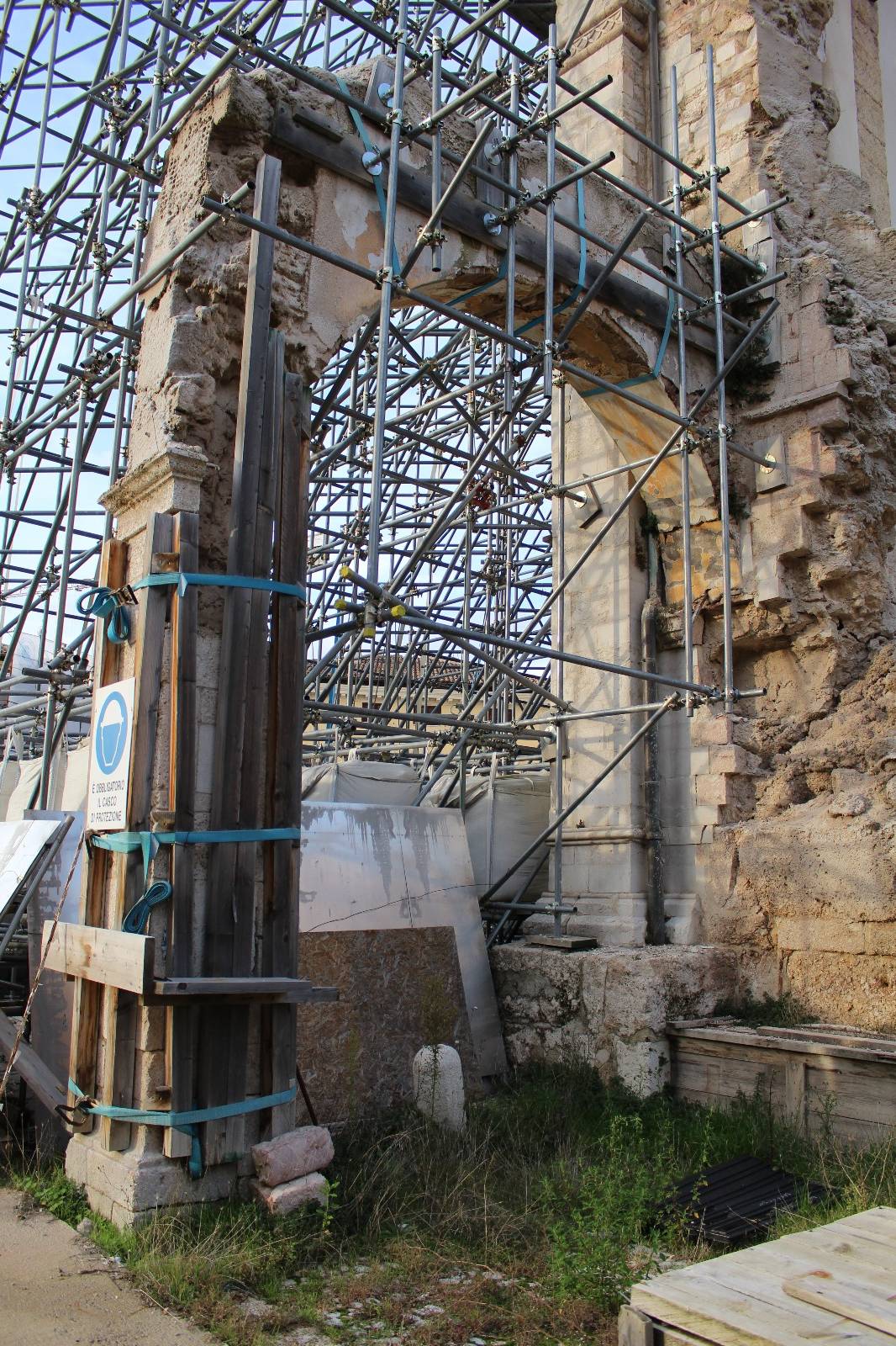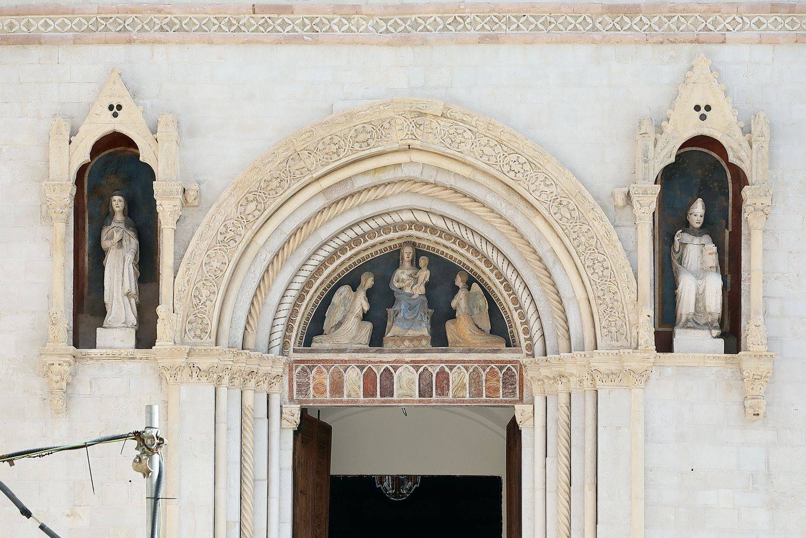 The paved surfaces outside the Basilica have been restored or repurposed with similar ones to those that existed before the collapse. Namely, the main staircase of the façade and the staircase of the transept’s secondary access have been subjected to a conservative cleaning and restoration operation, with possible replacement of elements that should prove to be unrecoverable. The restoration of all the frames that survived the collapse has also been planned: particular attention was given to the wooden doors of the main and side entrance (transept), as well as the wooden door of the sacristy.