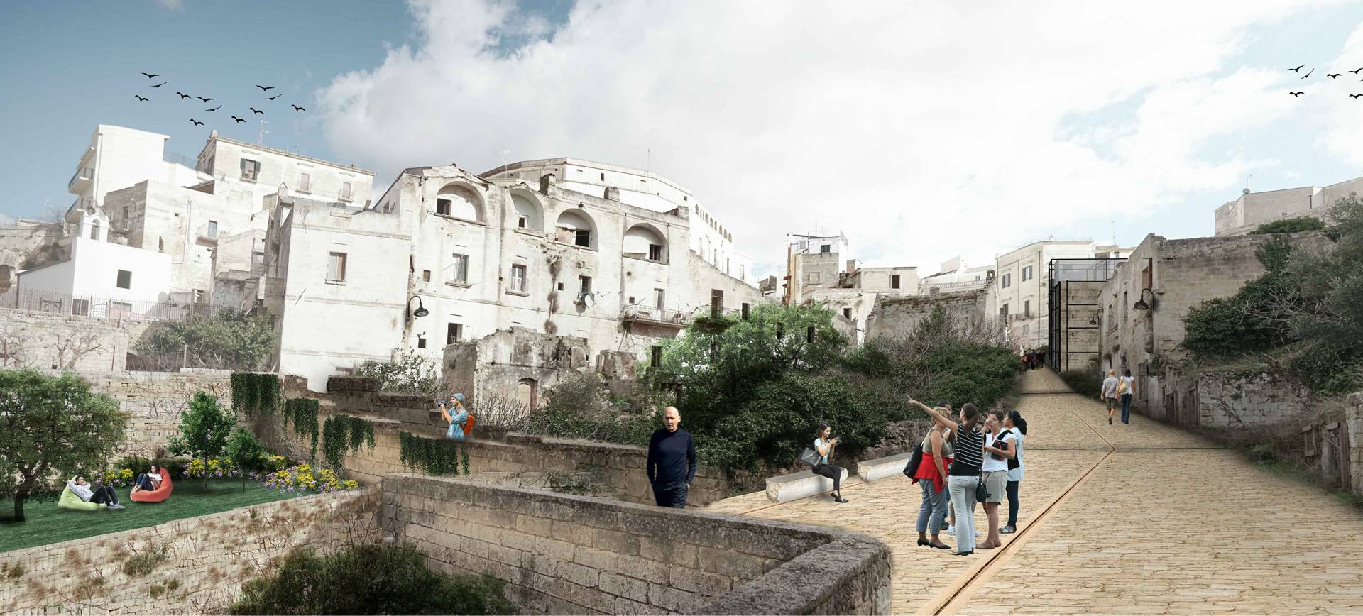 Saranno realizzati nuovi belvedere panoramici in punti strategici, cercando di inquadrare viste paesaggistiche de La Gravina, il parco naturale di Botromagno e le architetture rupestri.