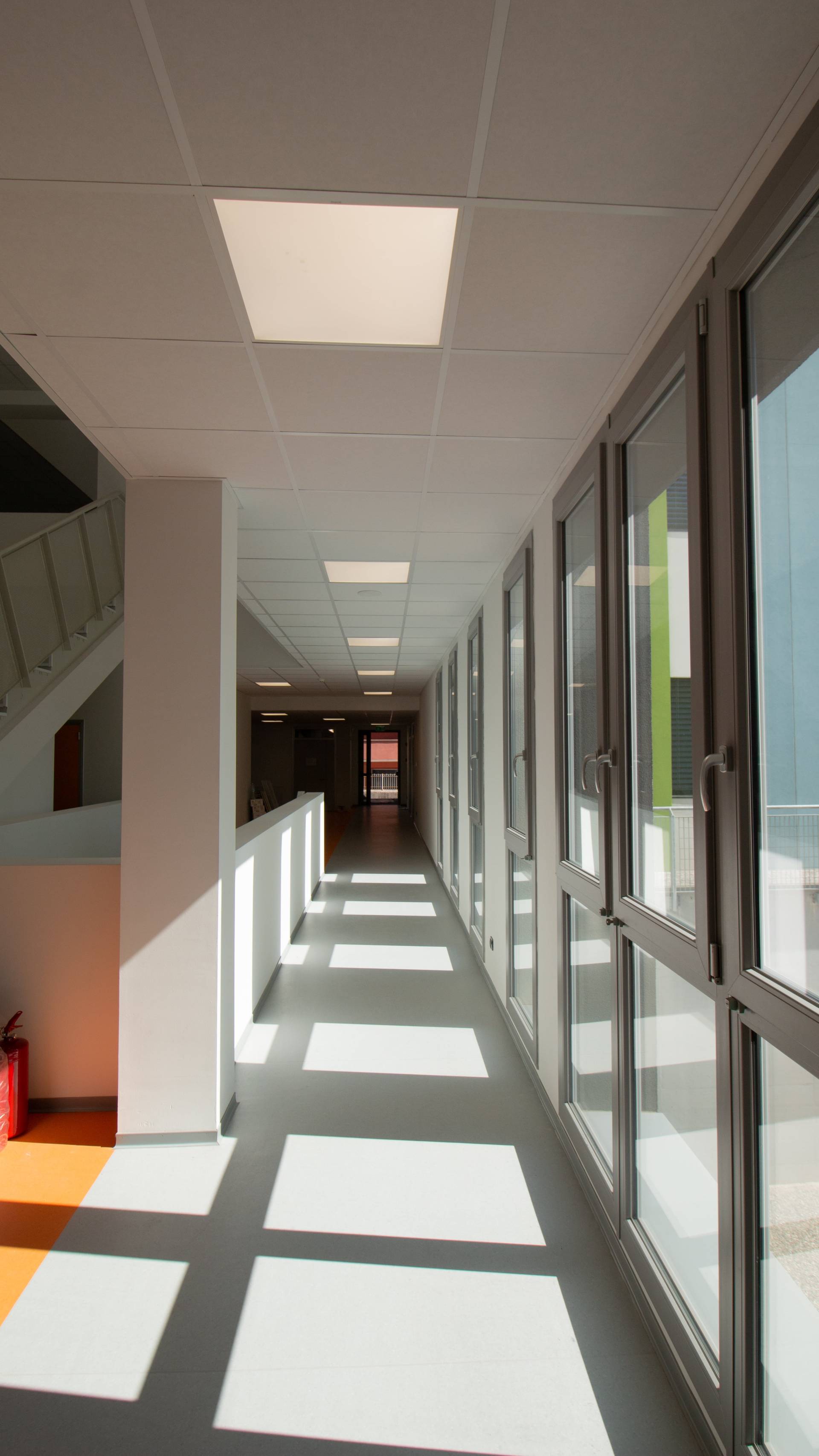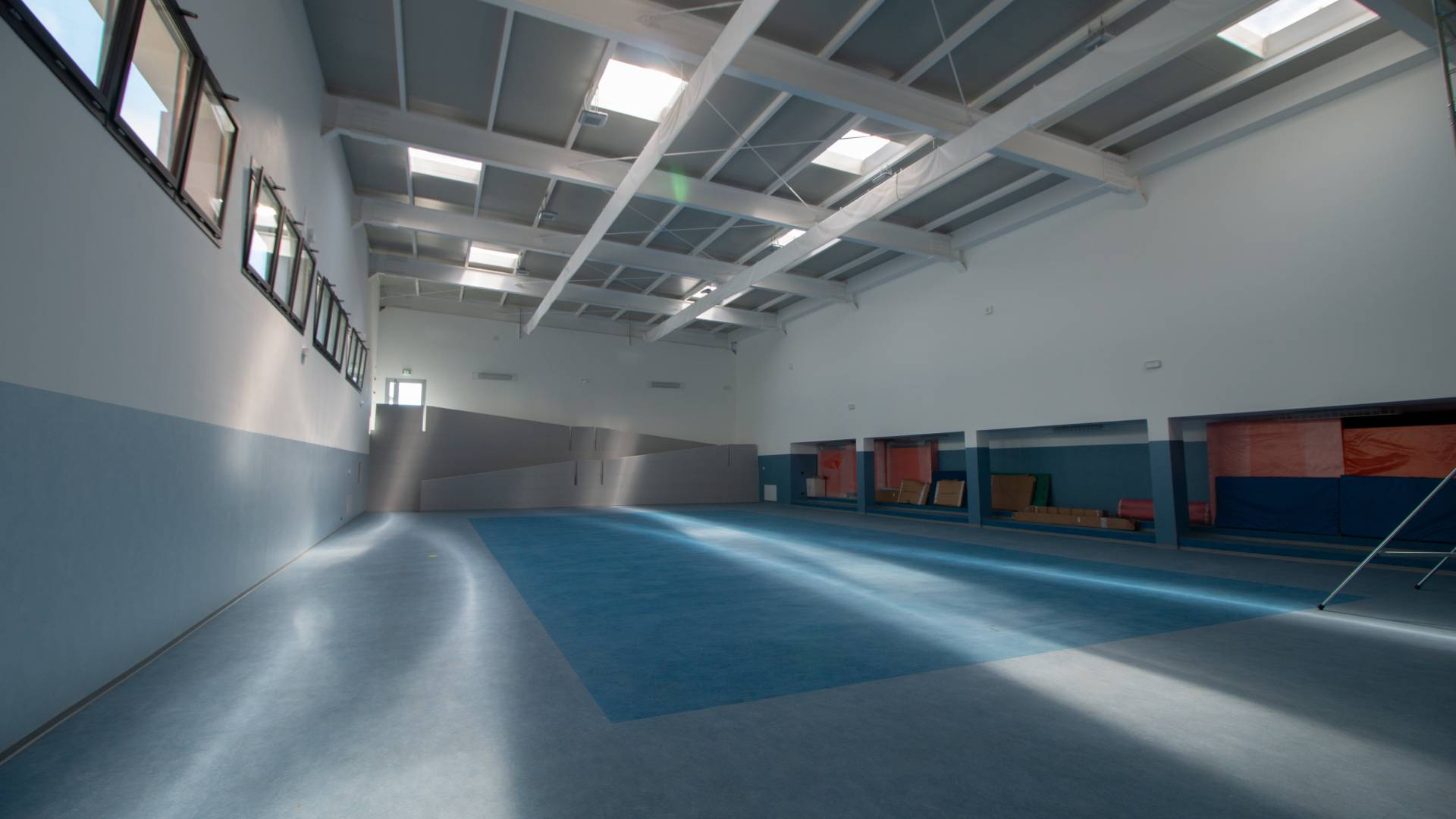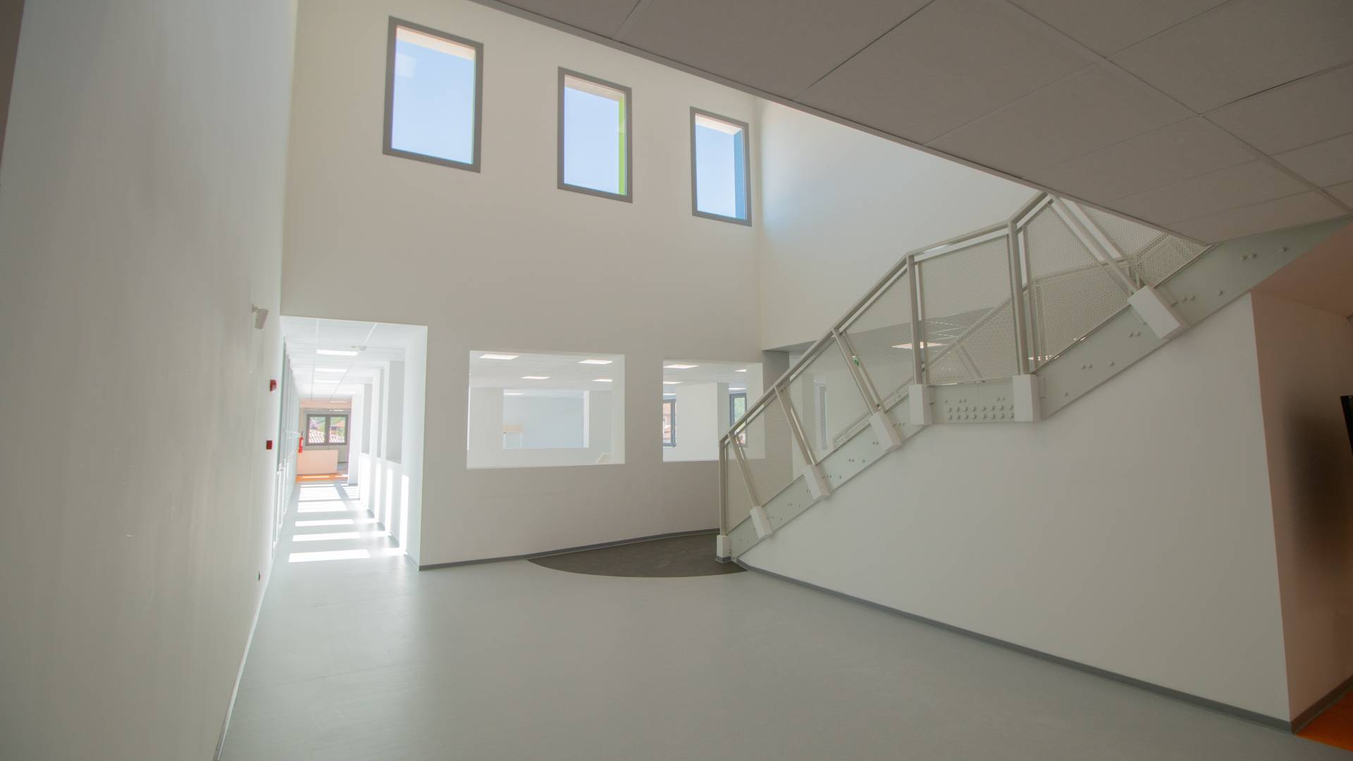 Questo ambito della nuova scuola avrà pavimenti e parziali rivestimenti delle pareti in PVC colorato, al fine di ridurre al minimo la rumorosità e consentire la massima igiene e sicurezza nei percorsi di transito delle scolaresche. La distribuzione degli ambienti prevede che al piano seminterrato vi sia la palestra con relativi spogliatoi e servizi igienici, l’aula magna, la mensa ed alcuni locali tecnici; al piano terra saranno ubicati l’atrio d’ingresso, la biblioteca, la direzione, i sistemi verticali di collegamento, la didattica della scuola primaria e la didattica della scuola media; al primo livello saranno posizionate la didattica della scuola primaria, la didattica della scuola media, l’atrio d’ingresso, la biblioteca, gli uffici della direzione, la terrazza ed il tetto giardino; al secondo livello ci sarà l’atrio d’ingresso, la didattica della scuola media e l’ascensore.