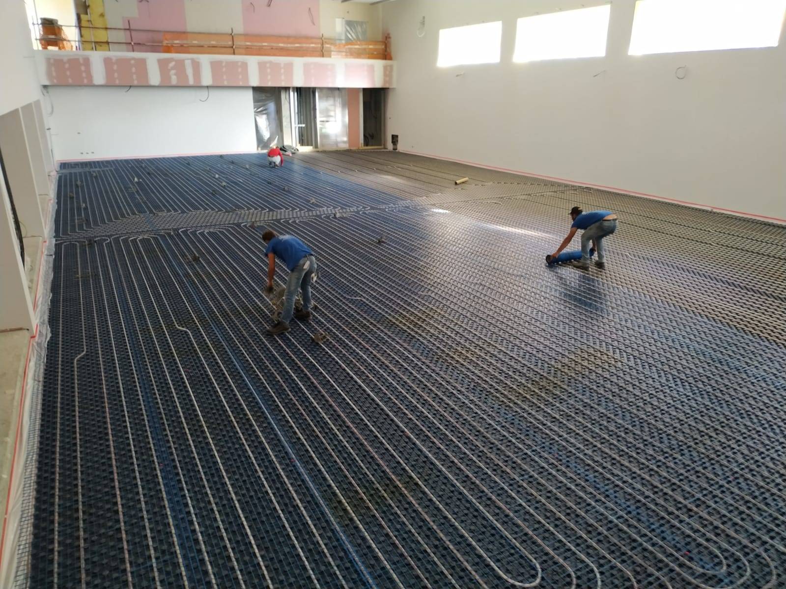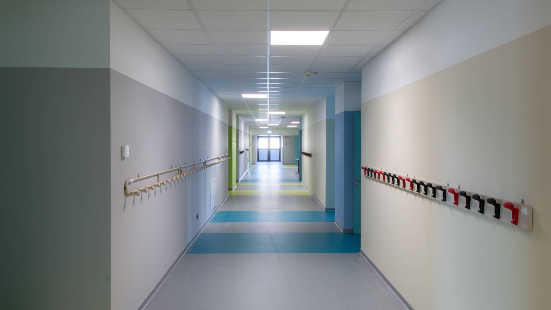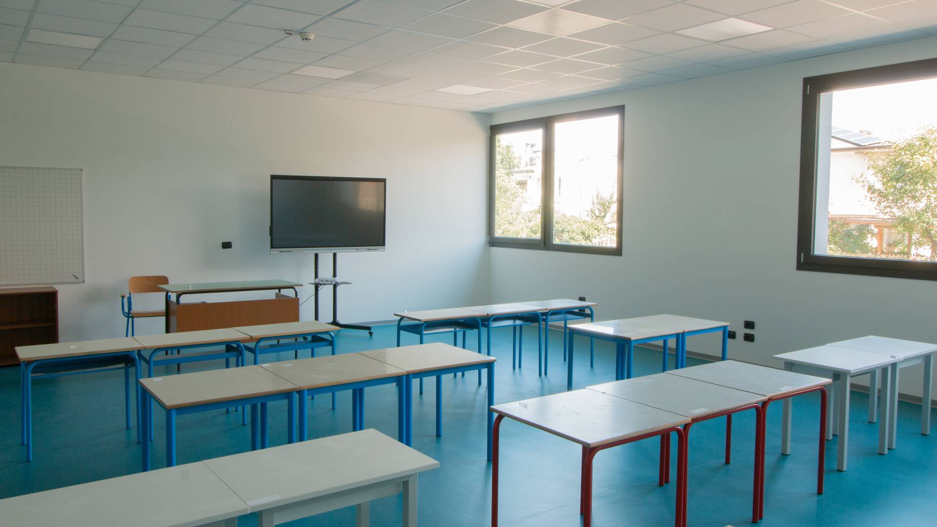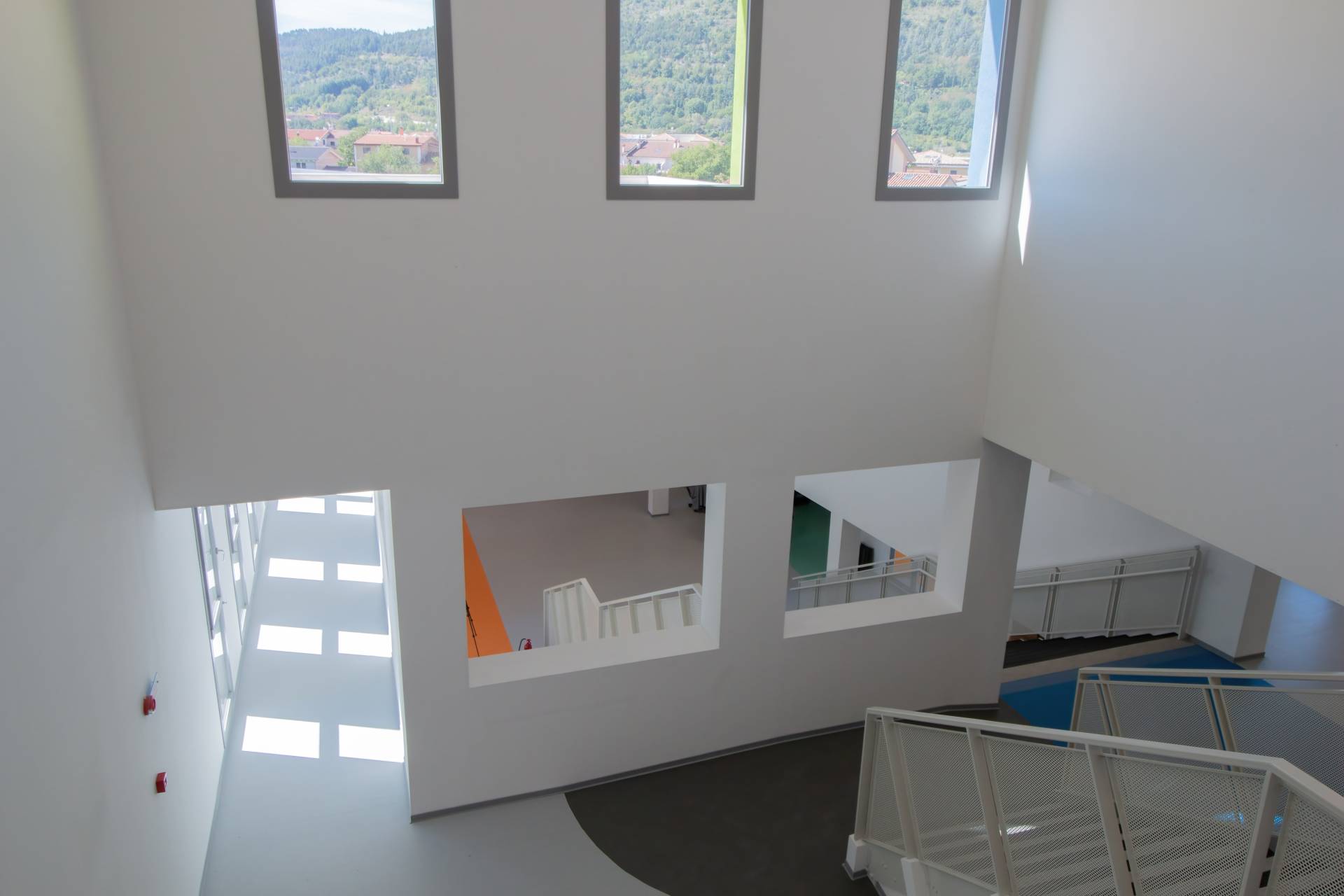 Questo ambito della nuova scuola avrà pavimenti e parziali rivestimenti delle pareti in PVC colorato, al fine di ridurre al minimo la rumorosità e consentire la massima igiene e sicurezza nei percorsi di transito delle scolaresche. La distribuzione degli ambienti prevede che al piano seminterrato vi sia la palestra con relativi spogliatoi e servizi igienici, l’aula magna, la mensa ed alcuni locali tecnici; al piano terra saranno ubicati l’atrio d’ingresso, la biblioteca, la direzione, i sistemi verticali di collegamento, la didattica della scuola primaria e la didattica della scuola media; al primo livello saranno posizionate la didattica della scuola primaria, la didattica della scuola media, l’atrio d’ingresso, la biblioteca, gli uffici della direzione, la terrazza ed il tetto giardino; al secondo livello ci sarà l’atrio d’ingresso, la didattica della scuola media e l’ascensore.