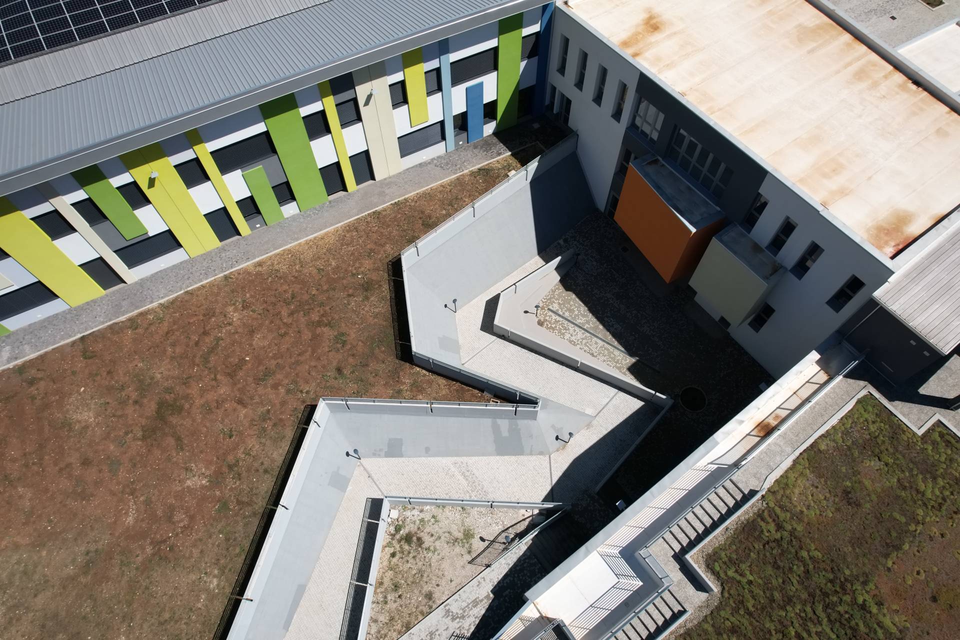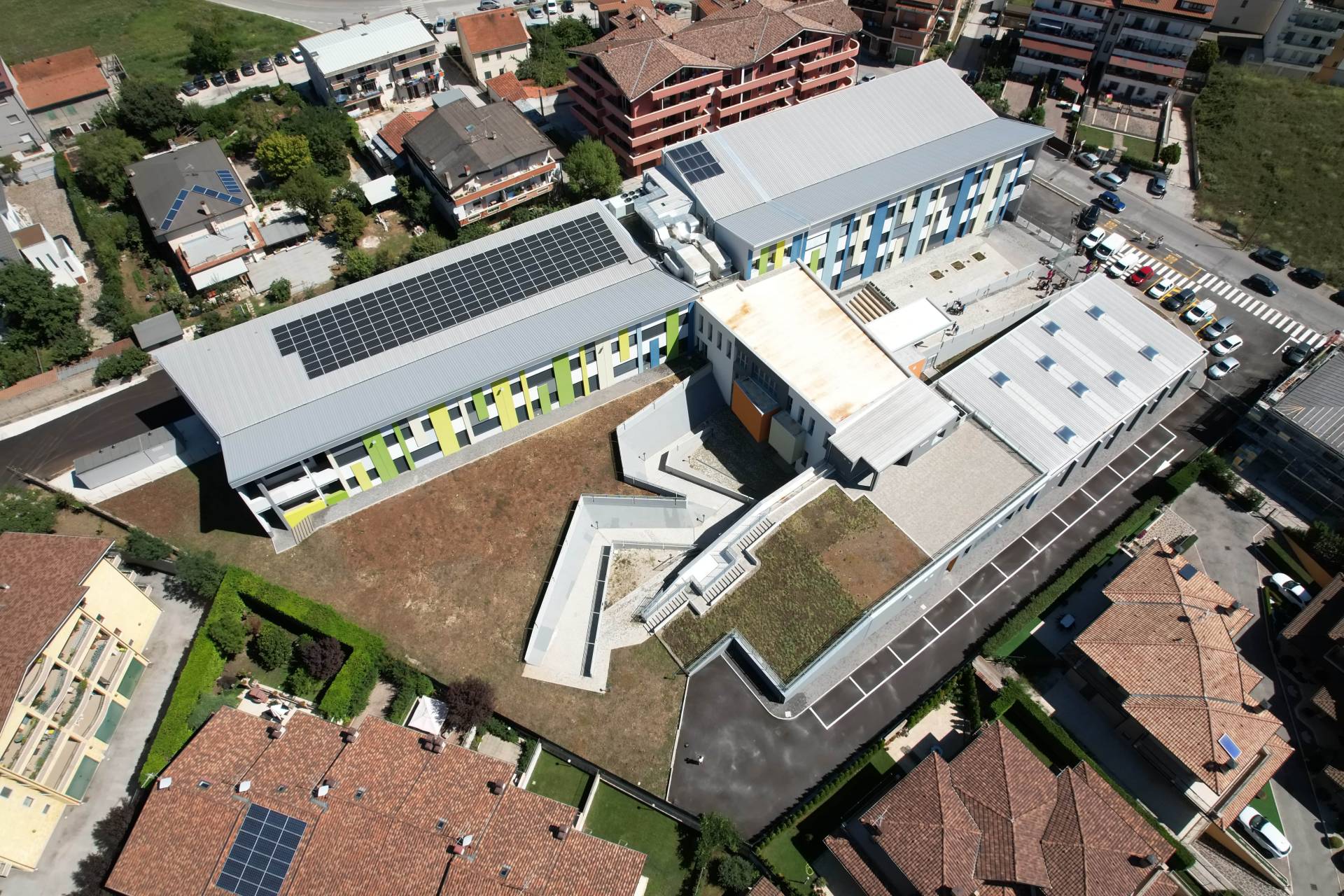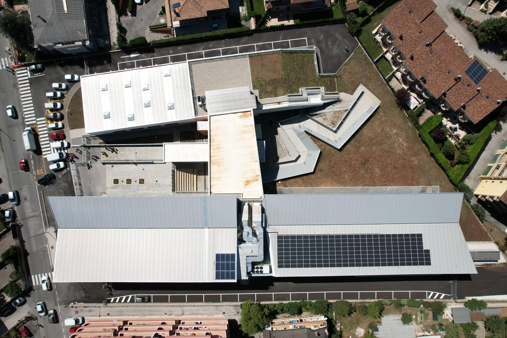 La struttura portante del nuovo edificio sarà composta da tre telai diversi, collegati tra loro da giunti tecnici poiché questi telai sorgeranno su fondazioni di diversa tipologia. Tale scelta è dovuta a prescrizioni di carattere geotecnico relativa al terreno di sedime. La struttura portante dell’intero edificio sarà costituita da travi e pilastri in acciaio, sormontata da una copertura a falde inclinate di circa 30°. Tali falde inclinate, con impluvio interno, saranno la base d’appoggio dei pannelli fotovoltaici e solari con esposizione a sud, ma saranno anche un ottimo sistema di raccolta delle acque meteoriche e delle nevi, che saranno, a loro volta, raccolte in un serbatoio per poi essere recuperate e riutilizzate.