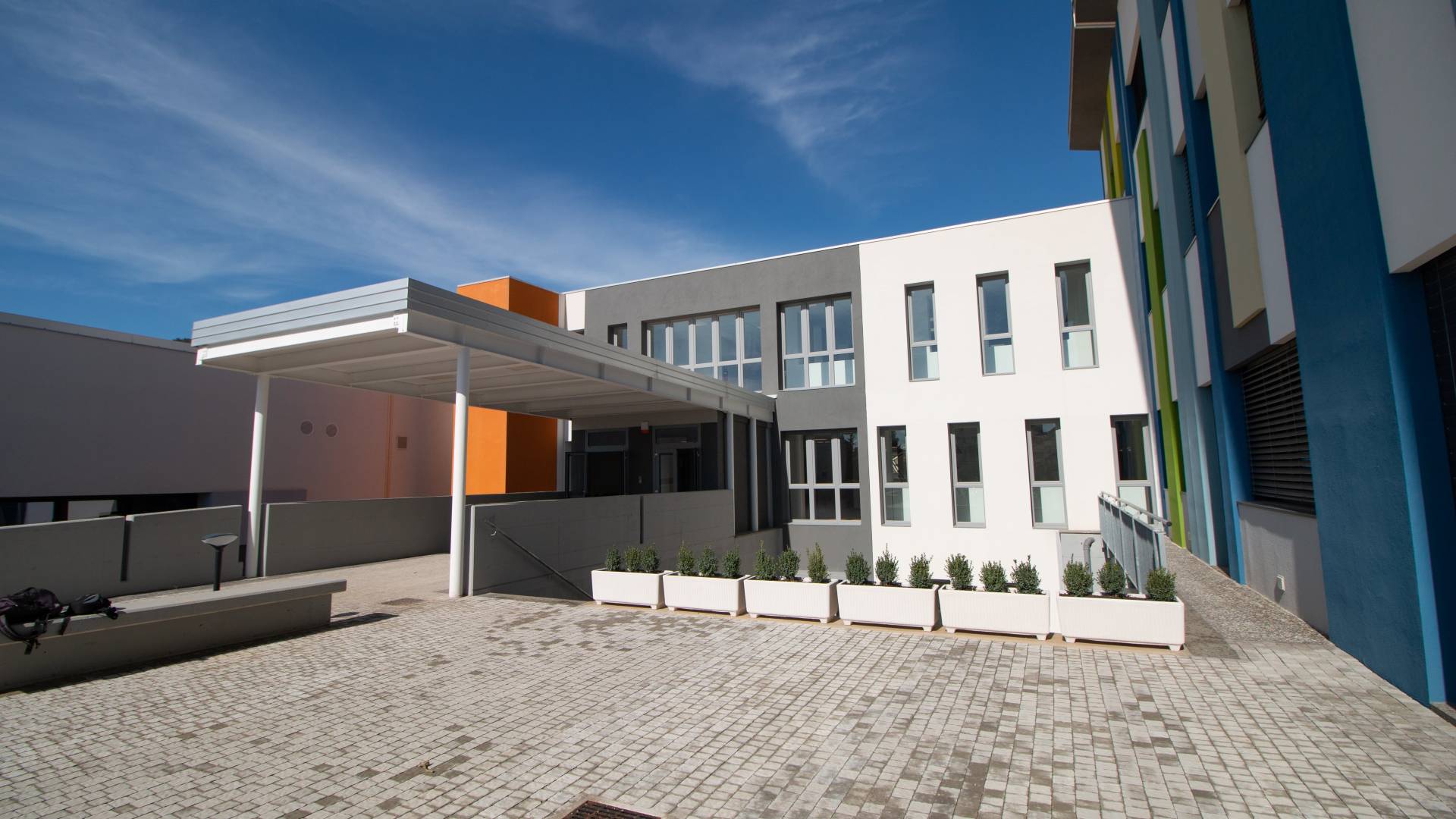 I prospetti saranno caratterizzati da ampie finestrature schermate da brise soleil. A partire dal centro del complesso, si congiunge un volume ortogonale ad esso che fungerà da ponte di collegamento con gli spazi della palestra e l’auditorium. Tale collegamento sarà costituito da grandi facciate vetrate, divenendo un ponte trasparente che consentirà la vista verso il giardino. Ai fini dell’accessibilità sono stati eseguiti attenti studi relativi alla viabilità e al parcheggio pertinenziale, al fine di gestire correttamente l’entrata, l’uscita e la sosta delle auto, prevedendo anche una zona destinata alla sosta dei mezzi pubblici per consentire la salita e la discesa degli studenti, in assoluta sicurezza, senza interferenze con i flussi automobilistici. Lo spazio dell’atrio avrà un importante valore funzionale poiché consentirà ai bambini dei primi anni ed agli studenti tutti un immediato e corretto orientamento all’interno. L’atrio sarà anche il giunto funzionale tra tutti gli spazi del complesso scolastico, collegamento con il giardino nei momenti di ricreazione, “ponte” verso la palestra e l’aula magna durante le ore di scuola, intermezzo verso la discesa alla mensa.