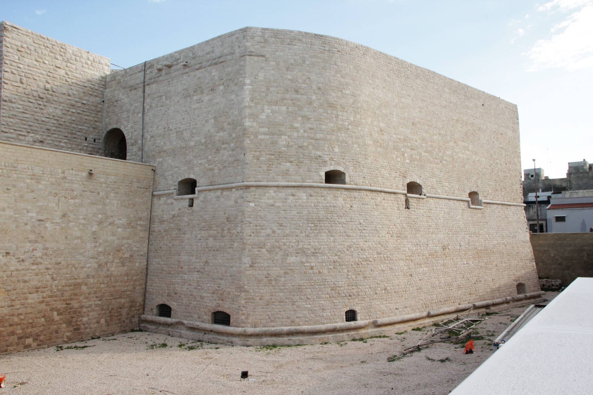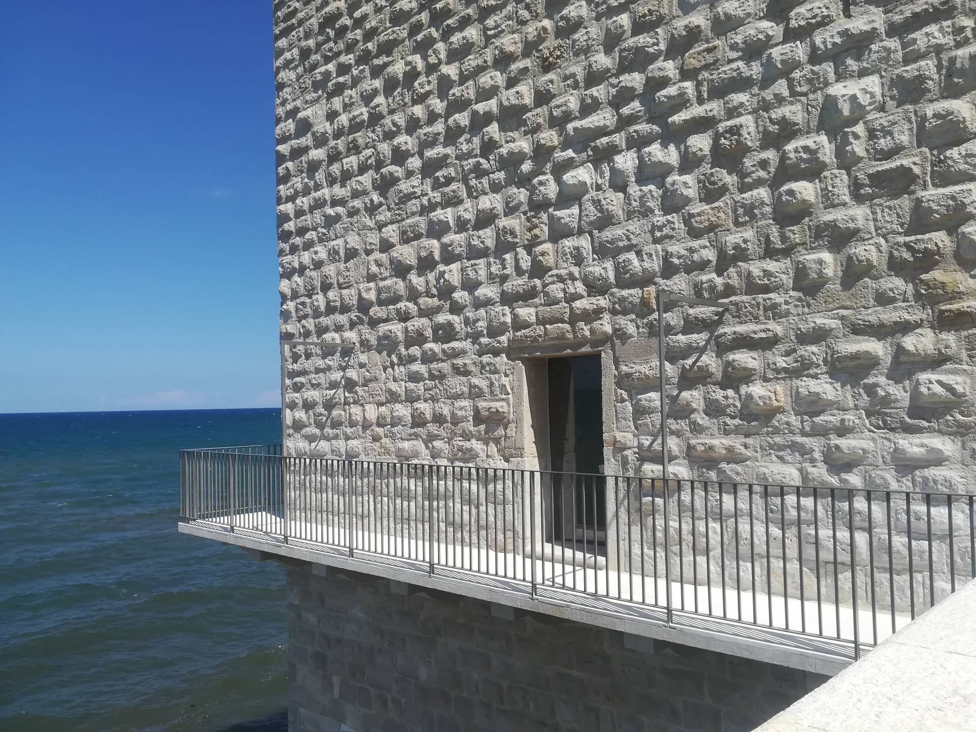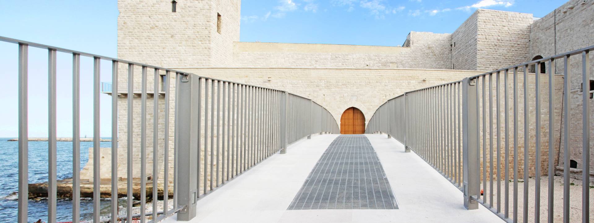 [...]Scopri di piùIl Castello Svevo di Trani sorge in riva al mare, a breve distanza dalla Cattedrale romanica e nel 1936 è stato dichiarato Monumento Nazionale con Regio Decreto. Gli interventi di cui è stato oggetto mirano alla sua valorizzazione e al miglioramento della sua fruibilità nell’ottica di aumentarne l’attrattività turistica. Una prima fase di consolidamento e ripristino delle finiture ha reso accessibili al pubblico tutti quegli spazi una volta impraticabili. Sono state ritinteggiate con pittura le pareti precedentemente rivestite ad intonaco, rimossi i depositi superficiali, sostituite le porzioni di pavimentazione ammalorate, colmate le lacune delle parti mancanti ed eseguita la pulitura. I paramenti interni, rivestiti in materiale lapideo, mostravano un discreto stato di degrado, pertanto su di essi è stata effettuata una pulitura meccanica, completata con un trattamento protettivo sul materiale lapideo. Le pareti non rivestite sono state ritinteggiate, così come anche le volte, con una preventiva rimozione di corpi estranei eseguita con spazzolatura e pulitura.