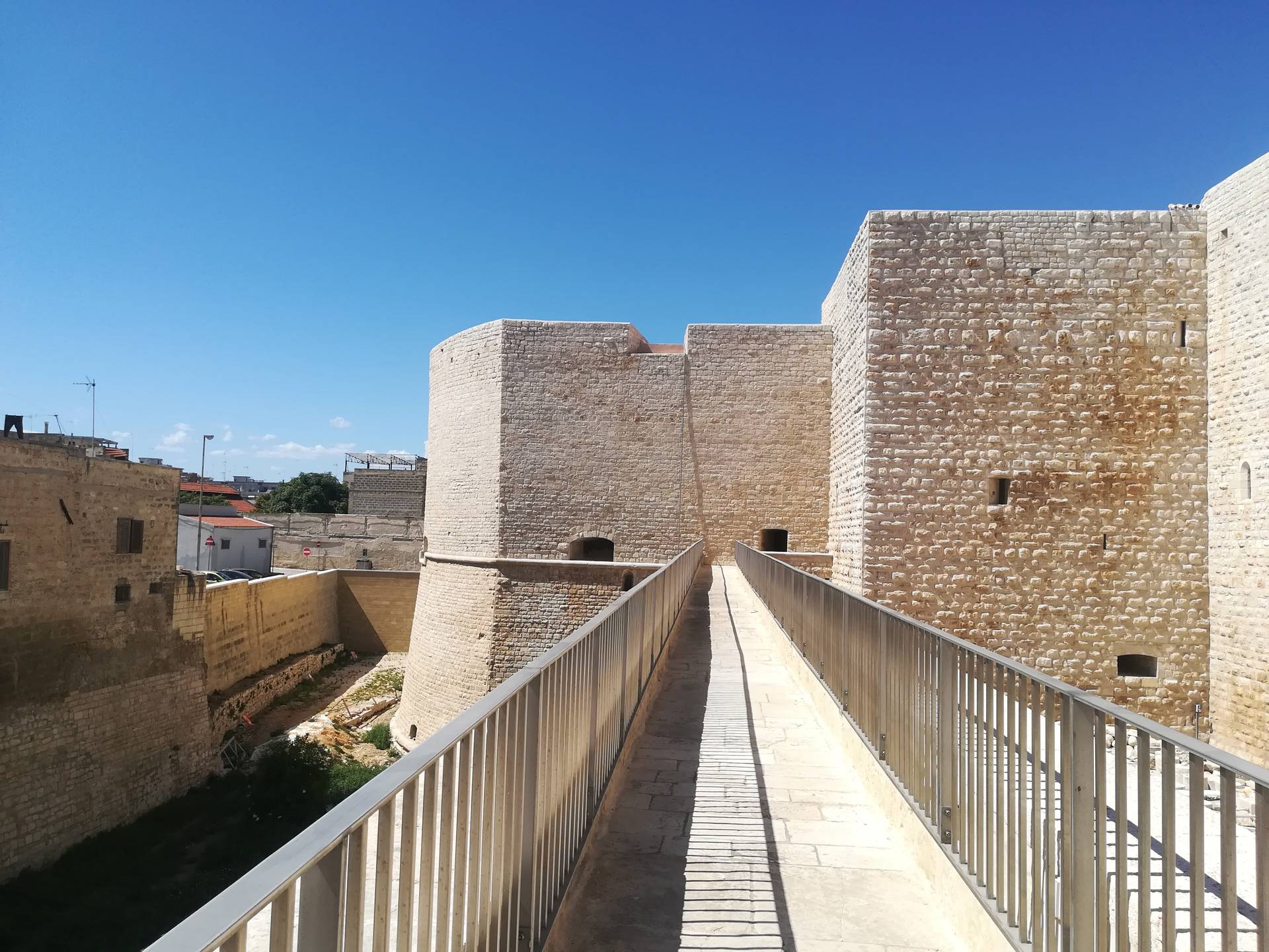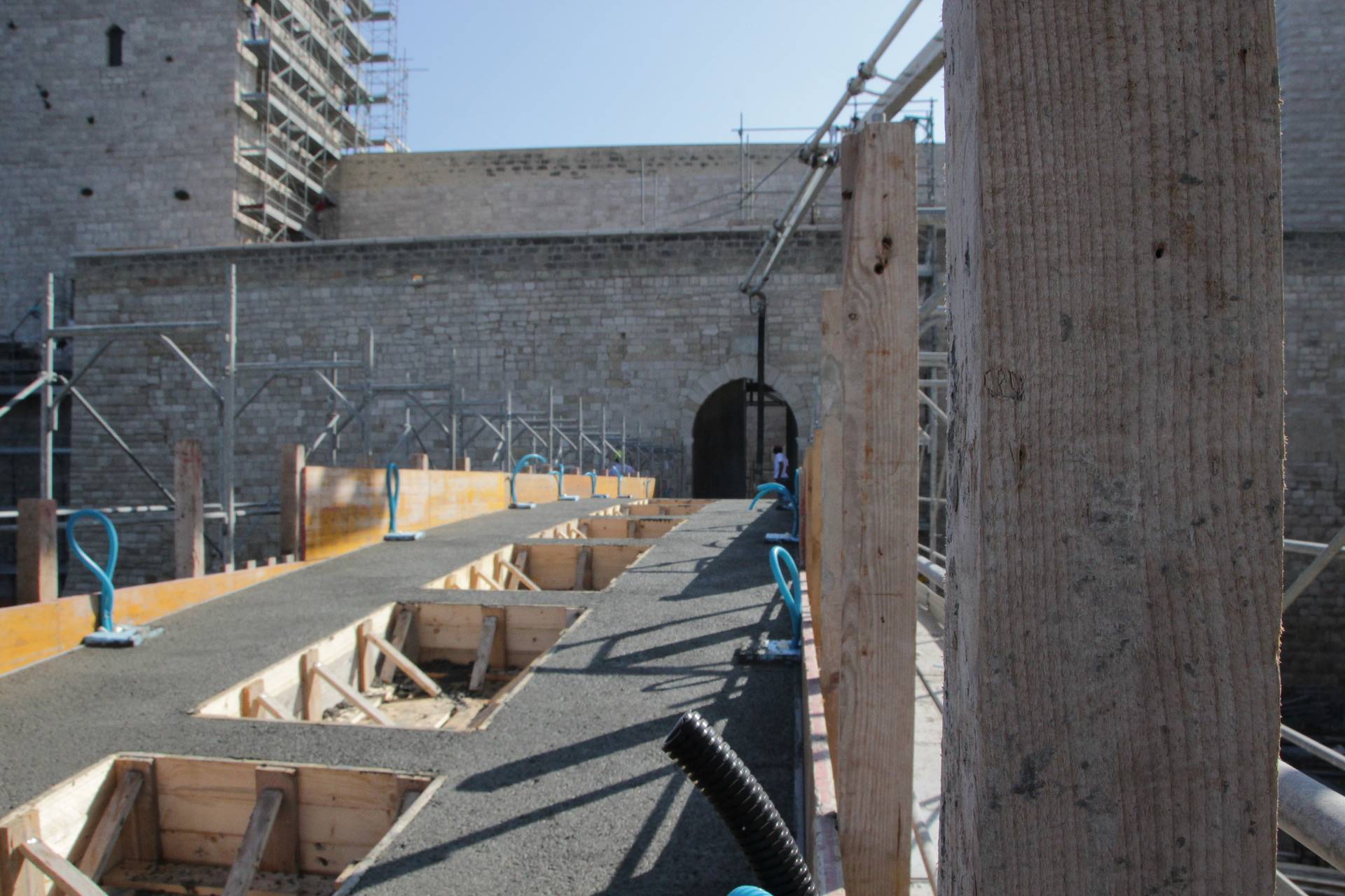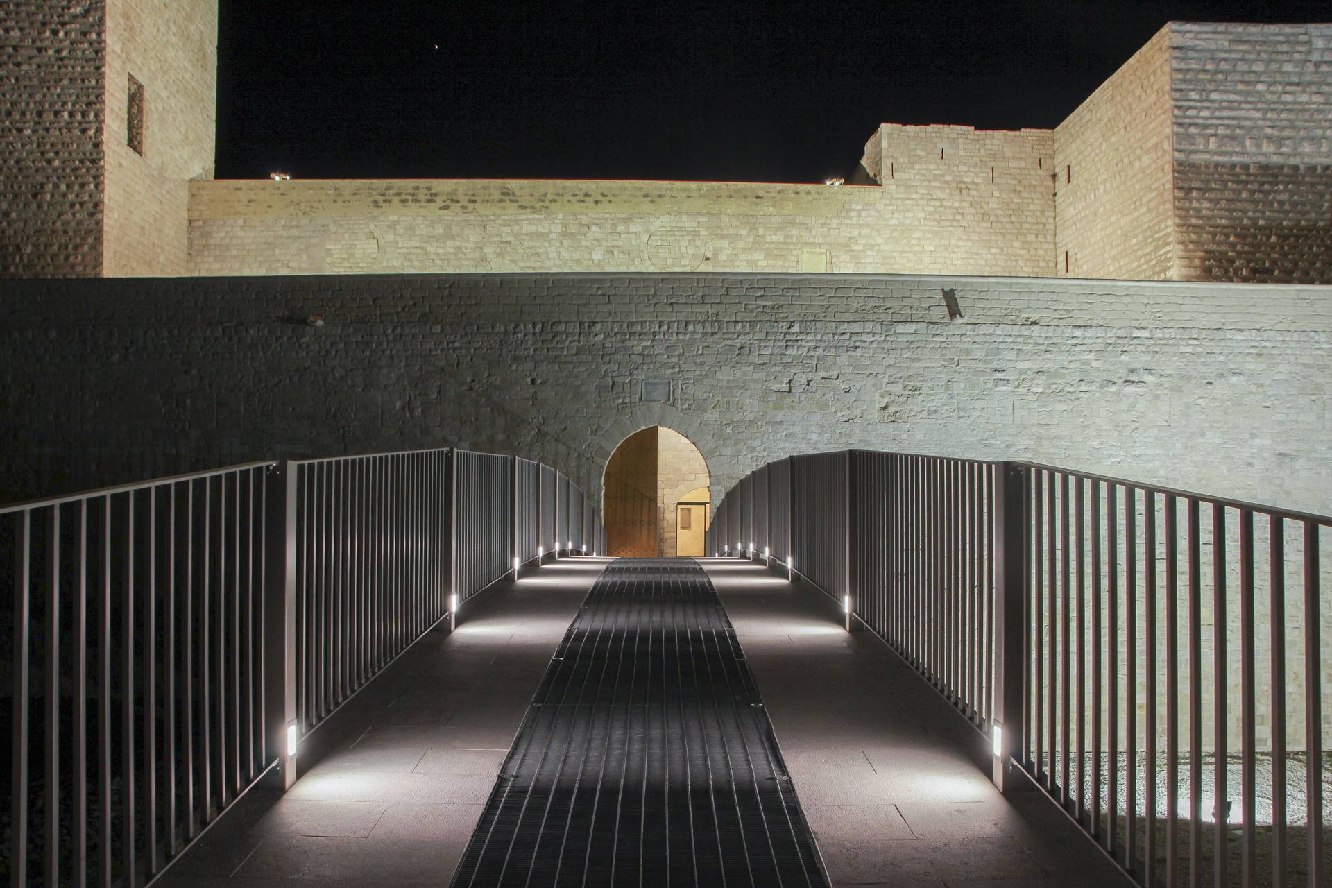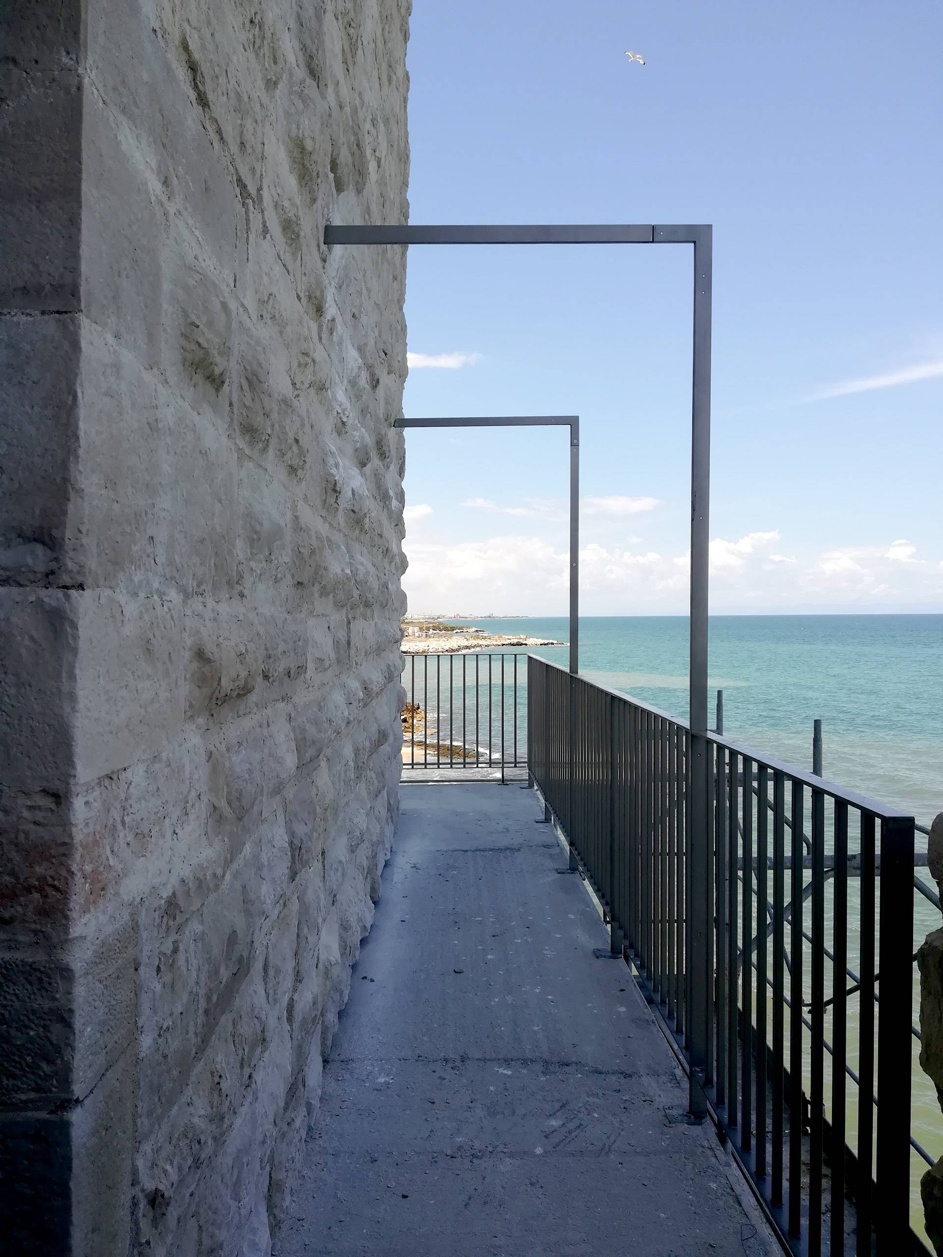 Al fine di creare continuità del prospetto interno sono stati innalzati i muretti di affaccio della terrazza sul cortile est, garantendo confort visivo e sicurezza durante il percorso. Dalle indagini bibliografiche e fotografiche si è evinto che in passato vi era un ballatoio sul lato nord- ovest che allo stato dei luoghi risultava essere mancante. Al fine di restituire le sue vestigia originarie, si è ritenuto opportuno ricostruire il ballatoio, dov’era com’era. È stato anche creato un collegamento pedonale necessario a superare un fossato tra il terrapieno a prolungamento di Via Maiorano e l’ingresso presente sulla cortina ovest del castello, sulla quale è ancora presente un’iscrizione in marmo del 1233. Il collegamento è stato realizzato attraverso un ponte ad unica campata e lungo circa 28 metri, la cui struttura è in calcestruzzo armato, ma è stato rivestito in pietra calcarea, in stile con il resto del manufatto.
