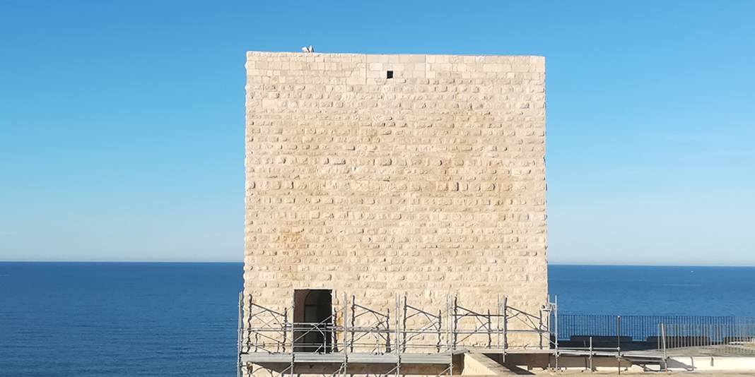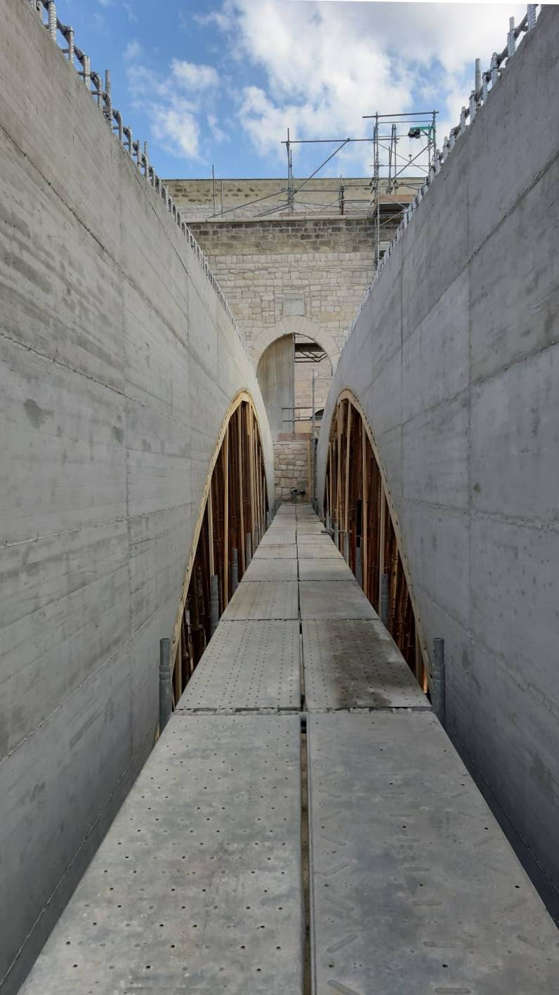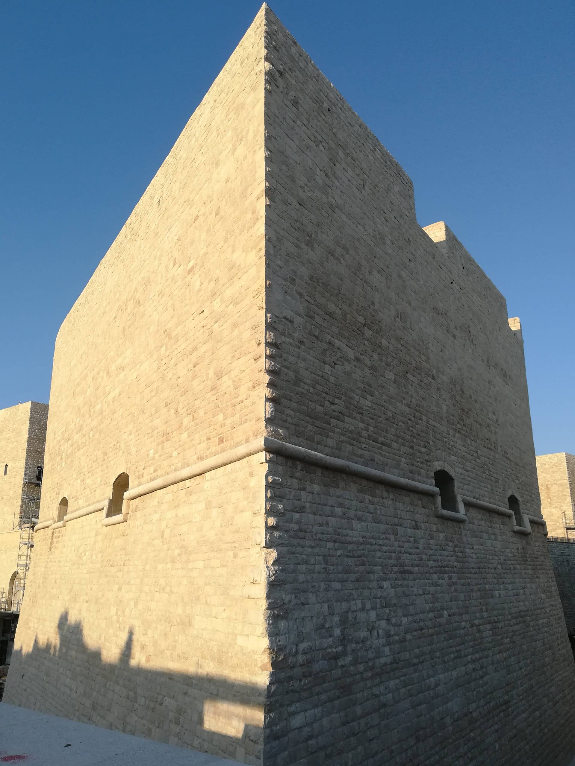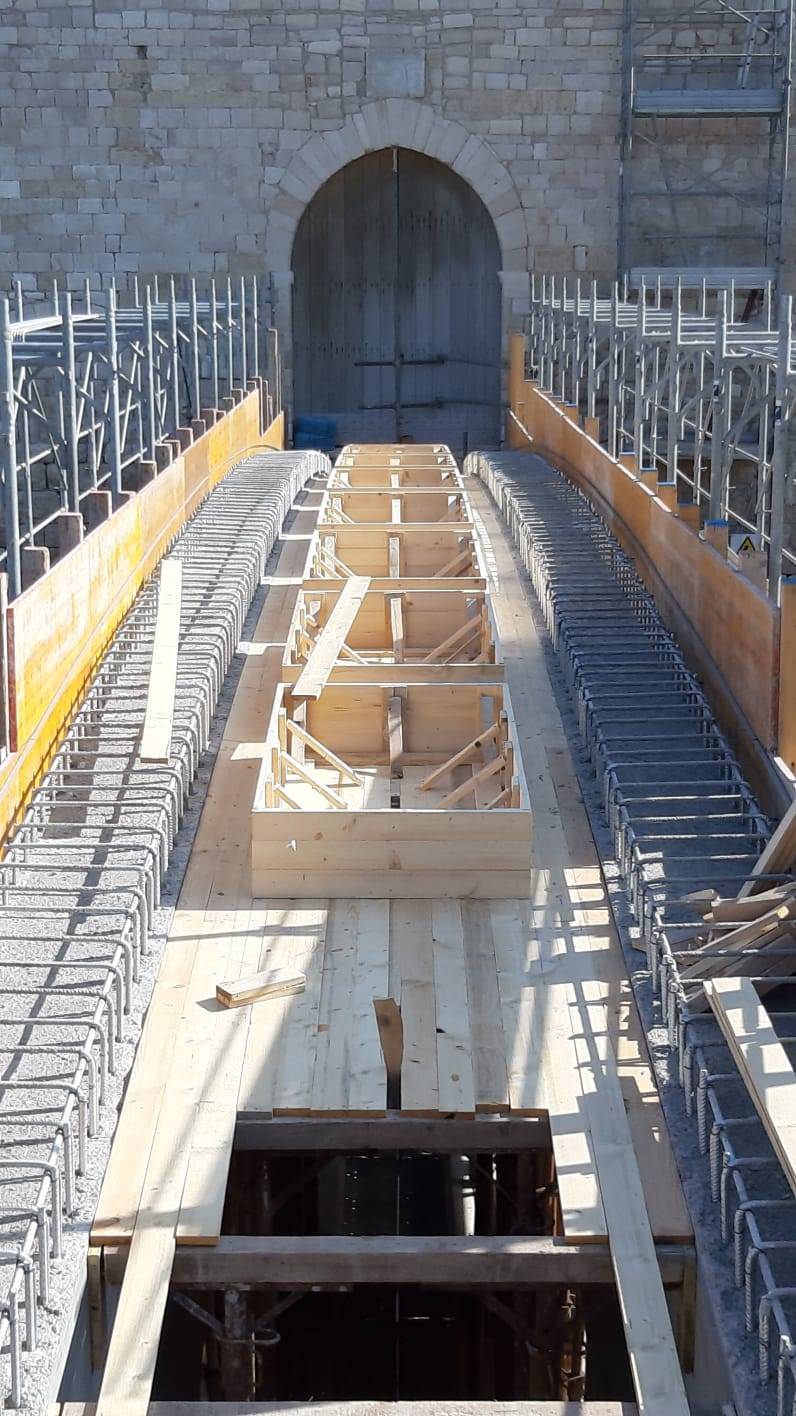 Al fine di creare continuità del prospetto interno sono stati innalzati i muretti di affaccio della terrazza sul cortile est, garantendo confort visivo e sicurezza durante il percorso. Dalle indagini bibliografiche e fotografiche si è evinto che in passato vi era un ballatoio sul lato nord- ovest che allo stato dei luoghi risultava essere mancante. Al fine di restituire le sue vestigia originarie, si è ritenuto opportuno ricostruire il ballatoio, dov’era com’era. È stato anche creato un collegamento pedonale necessario a superare un fossato tra il terrapieno a prolungamento di Via Maiorano e l’ingresso presente sulla cortina ovest del castello, sulla quale è ancora presente un’iscrizione in marmo del 1233. Il collegamento è stato realizzato attraverso un ponte ad unica campata e lungo circa 28 metri, la cui struttura è in calcestruzzo armato, ma è stato rivestito in pietra calcarea, in stile con il resto del manufatto.