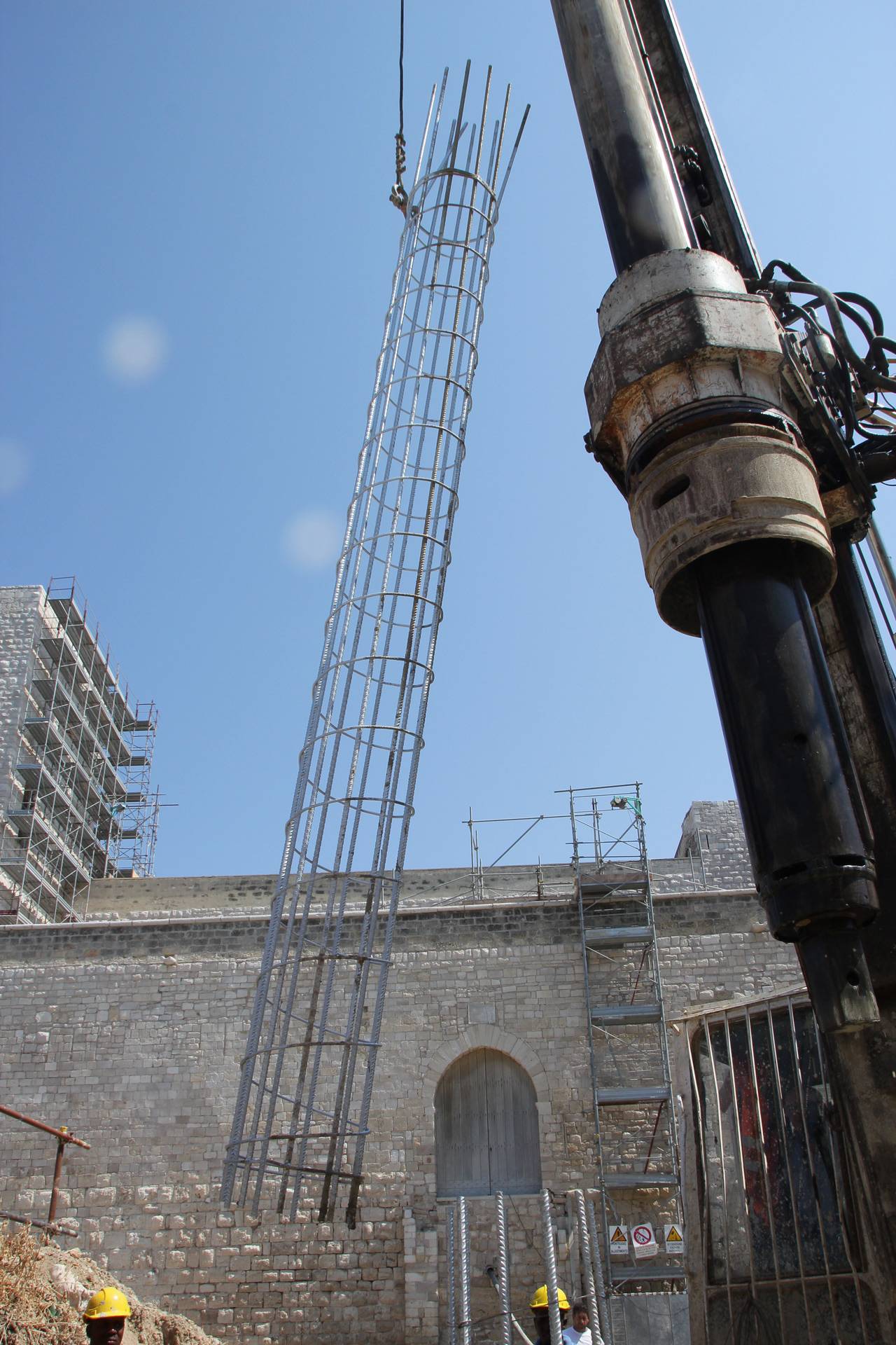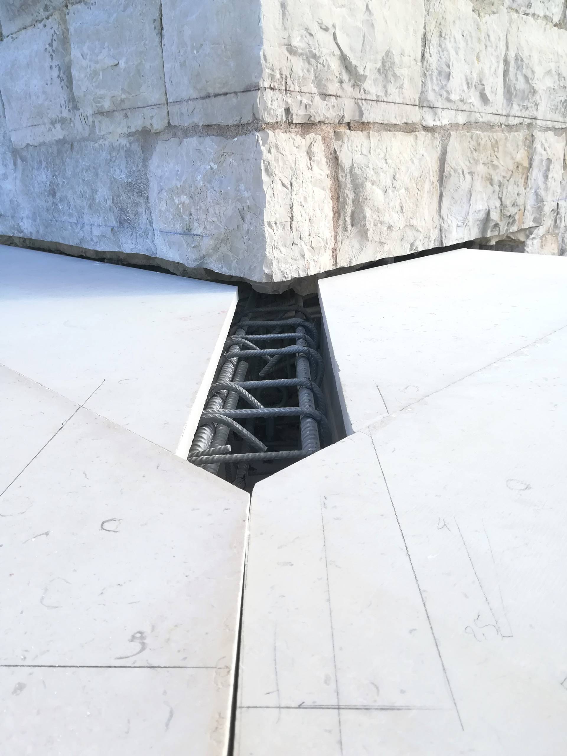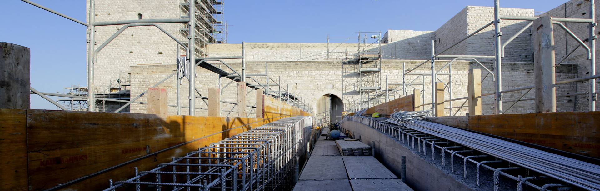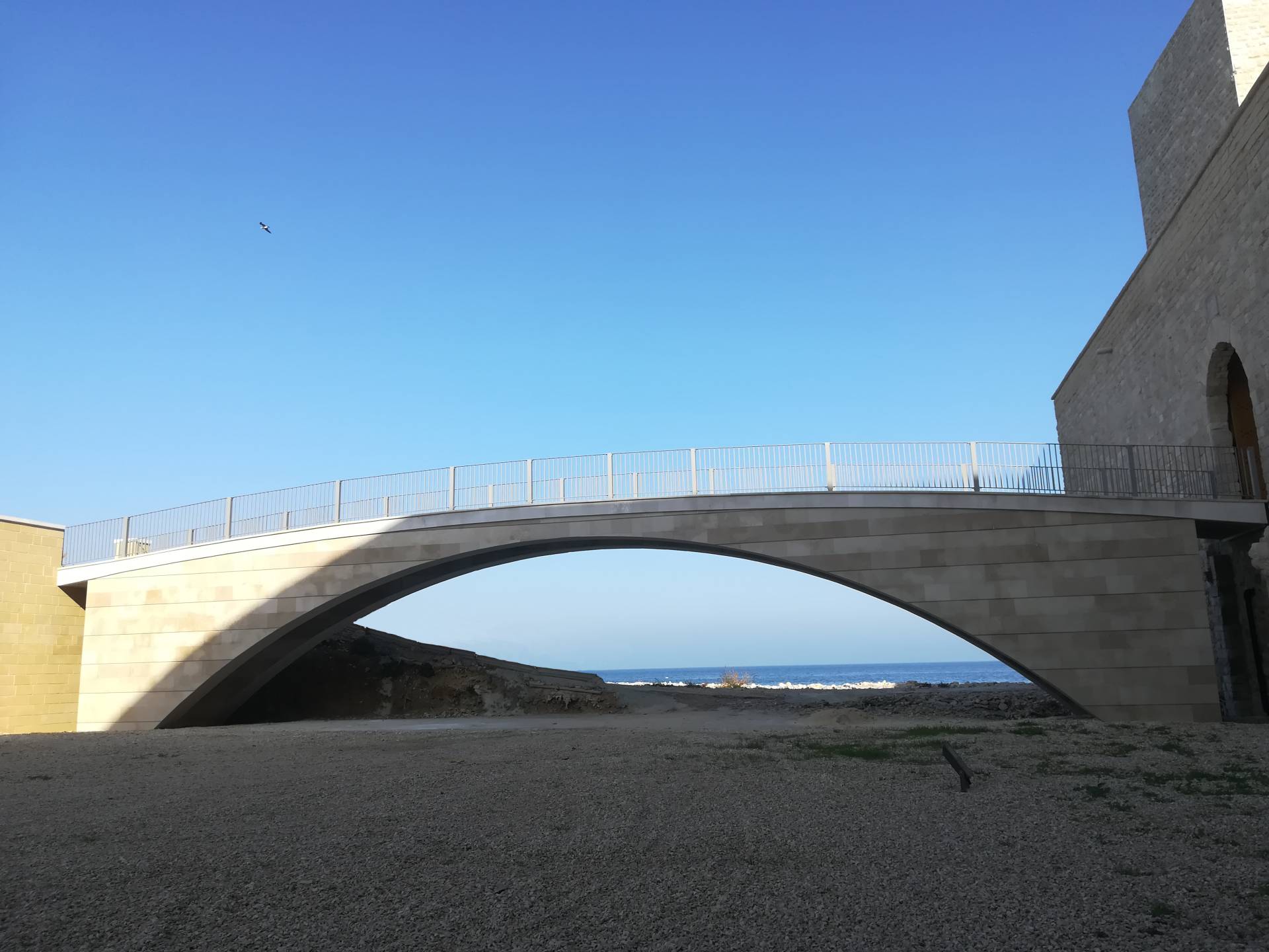Al fine di creare continuità del prospetto interno sono stati innalzati i muretti di affaccio della terrazza sul cortile est, garantendo confort visivo e sicurezza durante il percorso. Dalle indagini bibliografiche e fotografiche si è evinto che in passato vi era un ballatoio sul lato nord- ovest che allo stato dei luoghi risultava essere mancante. Al fine di restituire le sue vestigia originarie, si è ritenuto opportuno ricostruire il ballatoio, dov’era com’era. È stato anche creato un collegamento pedonale necessario a superare un fossato tra il terrapieno a prolungamento di Via Maiorano e l’ingresso presente sulla cortina ovest del castello, sulla quale è ancora presente un’iscrizione in marmo del 1233. Il collegamento è stato realizzato attraverso un ponte ad unica campata e lungo circa 28 metri, la cui struttura è in calcestruzzo armato, ma è stato rivestito in pietra calcarea, in stile con il resto del manufatto.