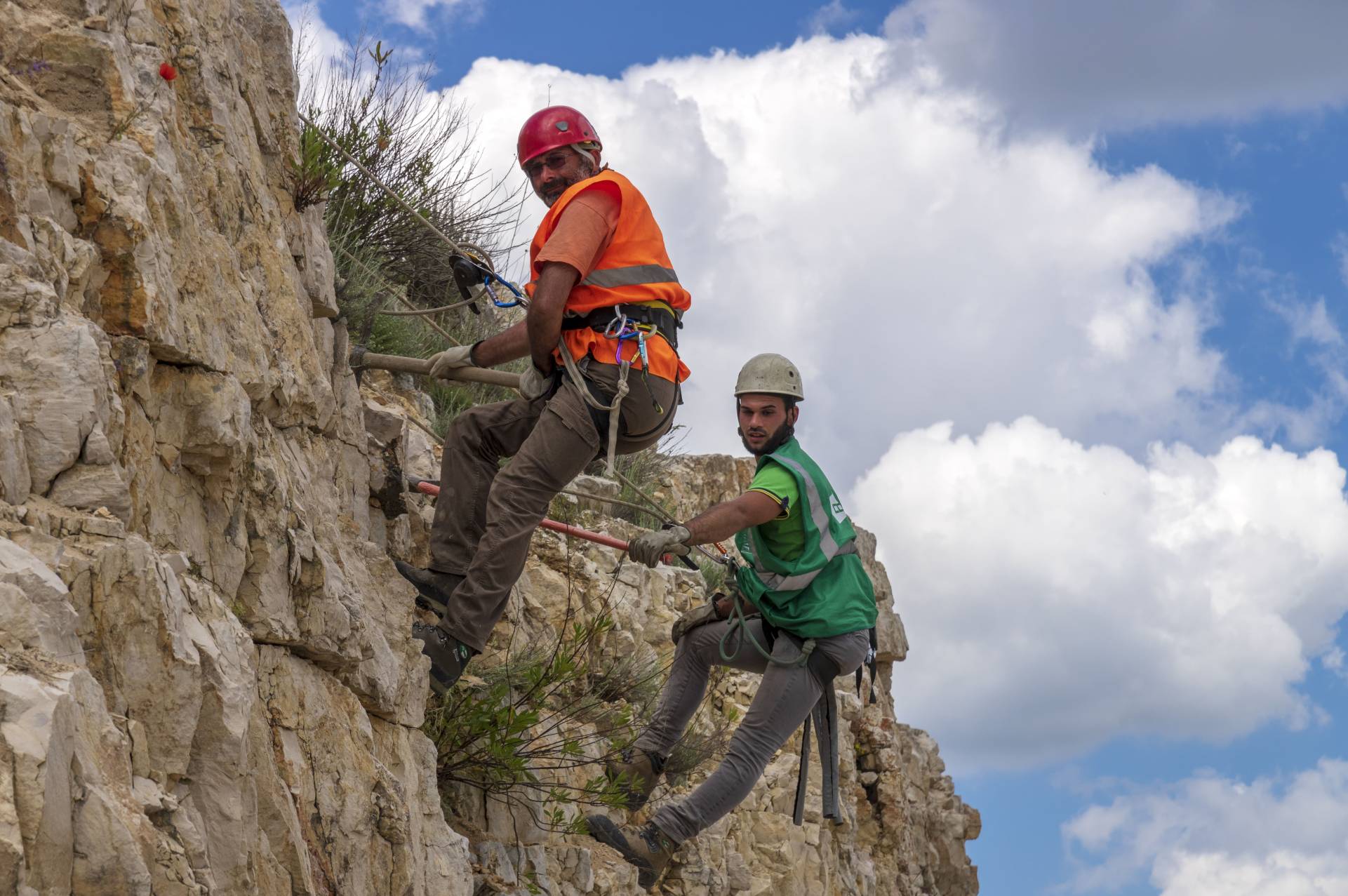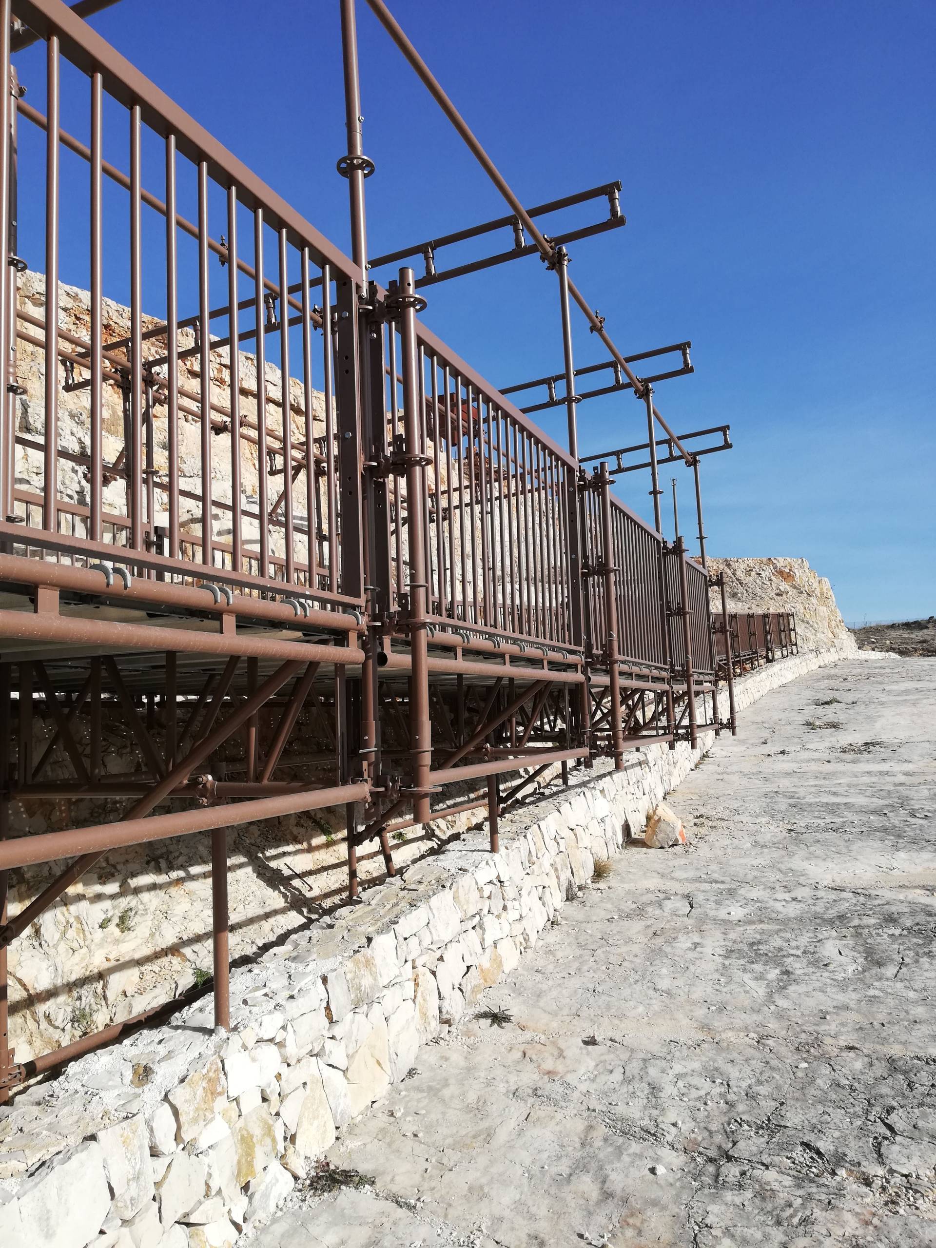 L’intervento più importante riguarda la parete che si trova a monte della passerella, che è stata edificata per permettere il passaggio dei visitatori. Su questa porzione di roccia sono state effettuate operazioni di disgaggio di blocchi di parete, chiodature in parete e realizzazione di barriera paramassi alla base della parete stessa, ossia a monte della prevista passerella.