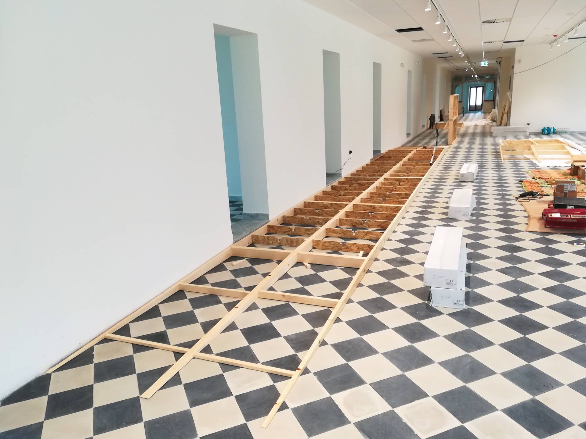 L’allestimento è stato progettato seguendo criteri di riutilizzo sostenibile, come previsto dallo U.S. Green Building Council. Sono state realizzate “scatole espositive” reversibili, indipendenti dalle pareti esistenti, per non alterare la struttura originale. Queste si trovano nel braccio Est-Ovest, ex celle monastiche, disposte in sequenza per richiamare la configurazione tipica del monastero.