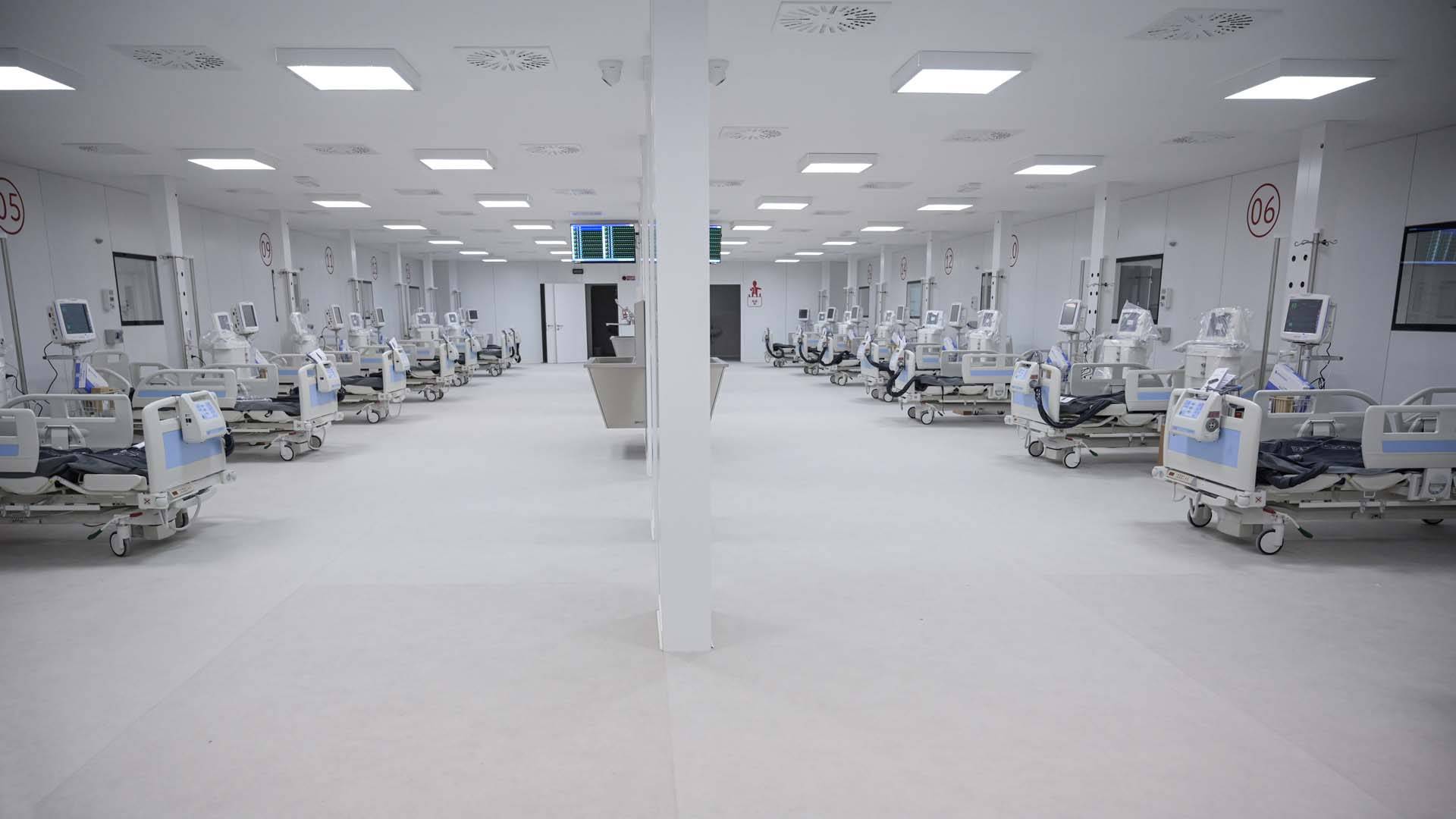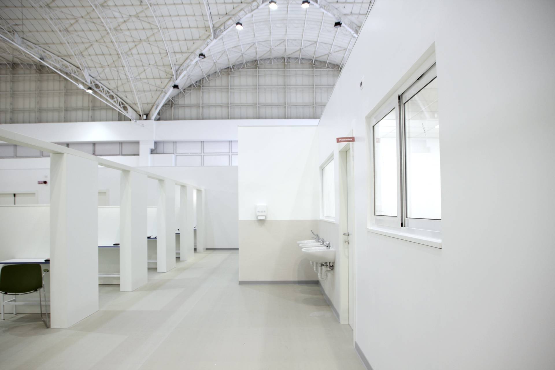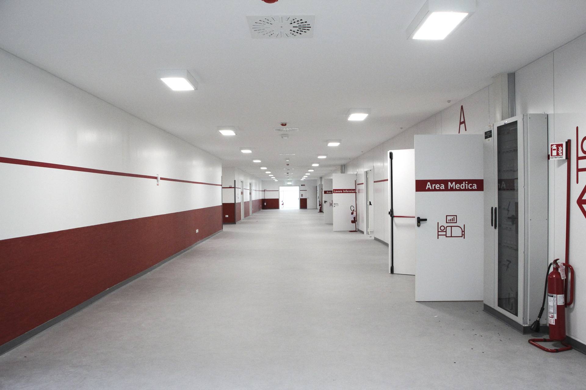 La distribuzione interna è stata ottenuta mediante pareti in cartongesso interamente riciclabili, dunque, nonostante l’emergenza, non è mancata l’attenzione nei confronti dell’ambiente. Le pareti in cartongesso sono state rivestite in PVC fino all’ altezza di 1 m, per facilitare la sanificazione degli ambienti. Diversa è la soluzione adottata nelle aree di terapia intensiva, dove le pareti sono realizzate in lastre di acciaio zincato rivestite con una pellicola estremamente sottile in PVC antibatterico a base di ioni d’argento. Sempre nelle zone di terapia intensiva, ogni posto letto è stato dotato di trave testaletto per i passaggi di tubi per la distribuzione di gas medicali, cavi di rete e distribuzione elettrica. Una pavimentazione in PVC differenziata per colore in base alle aree d’appartenenza distingue i percorsi interni ai padiglioni. Successivamente altri padiglioni sono stati adibiti a centro dialisi, centro direzionale, front – office e hub vaccinale.  Sono anche state ripristinate le coperture esistenti che versavano in condizioni di fatiscenza.