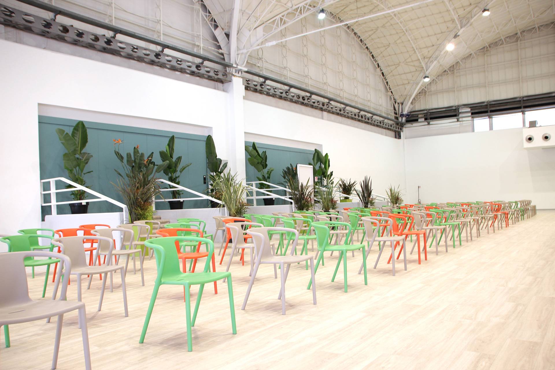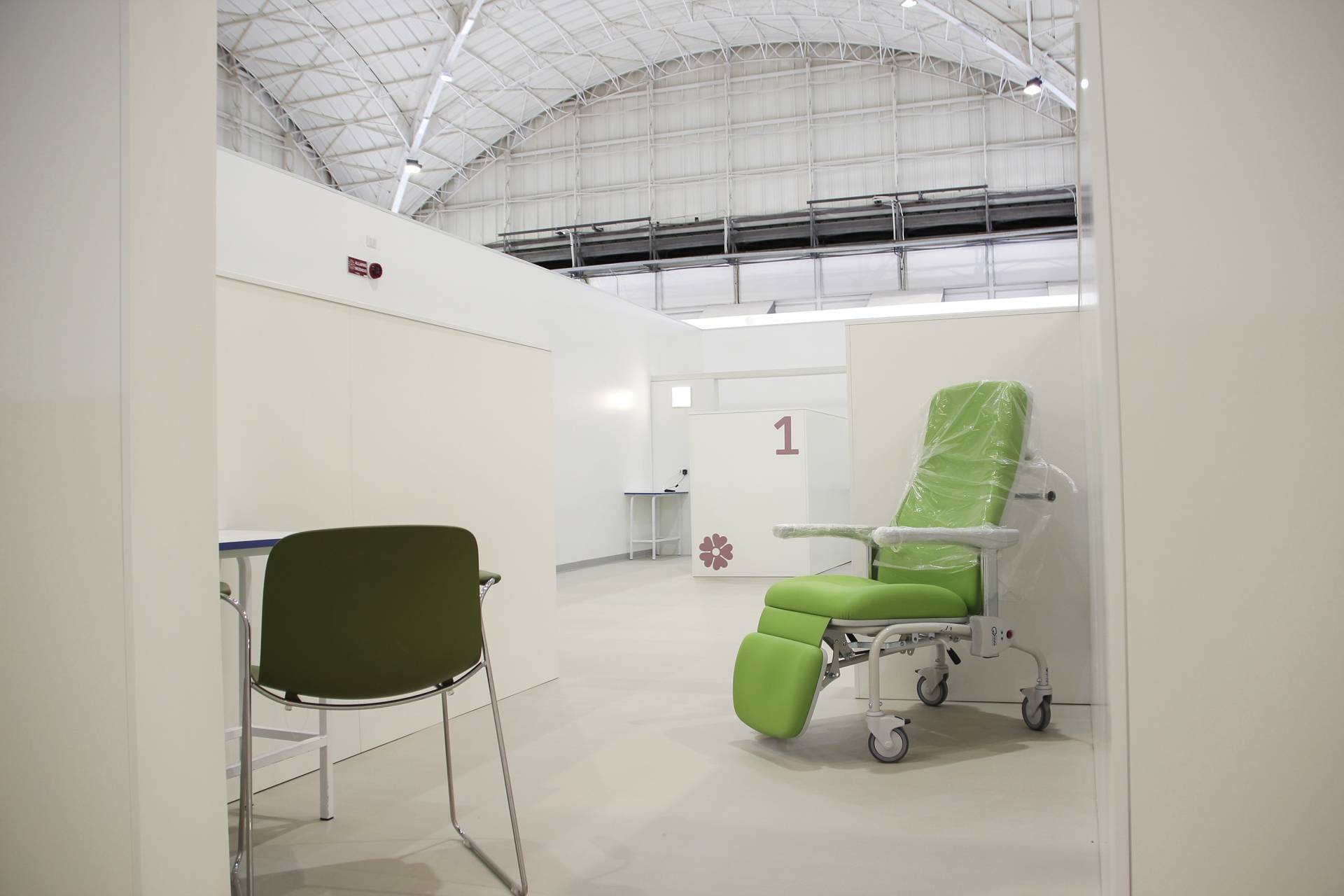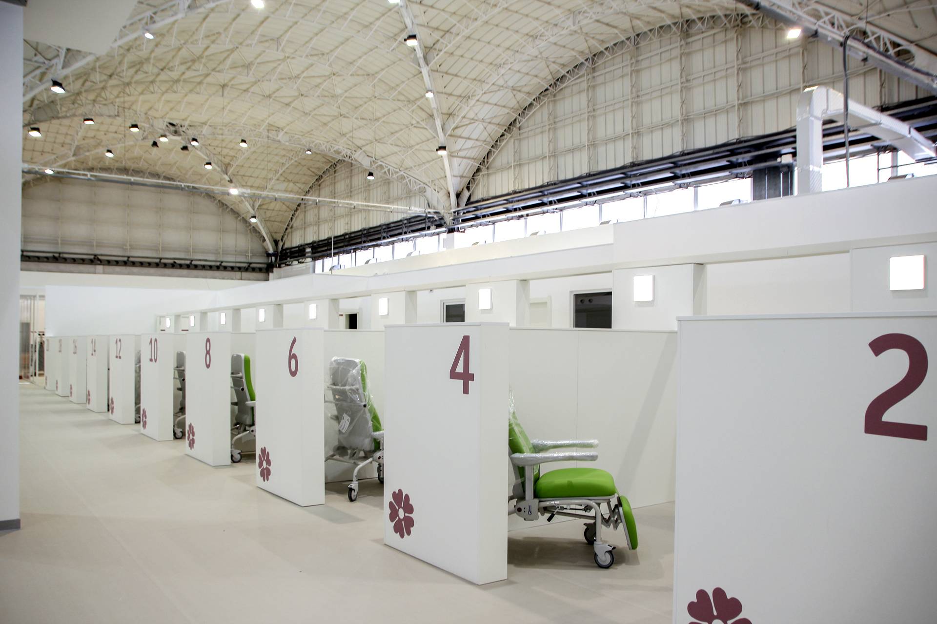 La distribuzione interna è stata ottenuta mediante pareti in cartongesso interamente riciclabili, dunque, nonostante l’emergenza, non è mancata l’attenzione nei confronti dell’ambiente. Le pareti in cartongesso sono state rivestite in PVC fino all’ altezza di 1 m, per facilitare la sanificazione degli ambienti. Diversa è la soluzione adottata nelle aree di terapia intensiva, dove le pareti sono realizzate in lastre di acciaio zincato rivestite con una pellicola estremamente sottile in PVC antibatterico a base di ioni d’argento. Sempre nelle zone di terapia intensiva, ogni posto letto è stato dotato di trave testaletto per i passaggi di tubi per la distribuzione di gas medicali, cavi di rete e distribuzione elettrica. Una pavimentazione in PVC differenziata per colore in base alle aree d’appartenenza distingue i percorsi interni ai padiglioni. Successivamente altri padiglioni sono stati adibiti a centro dialisi, centro direzionale, front – office e hub vaccinale.  Sono anche state ripristinate le coperture esistenti che versavano in condizioni di fatiscenza.