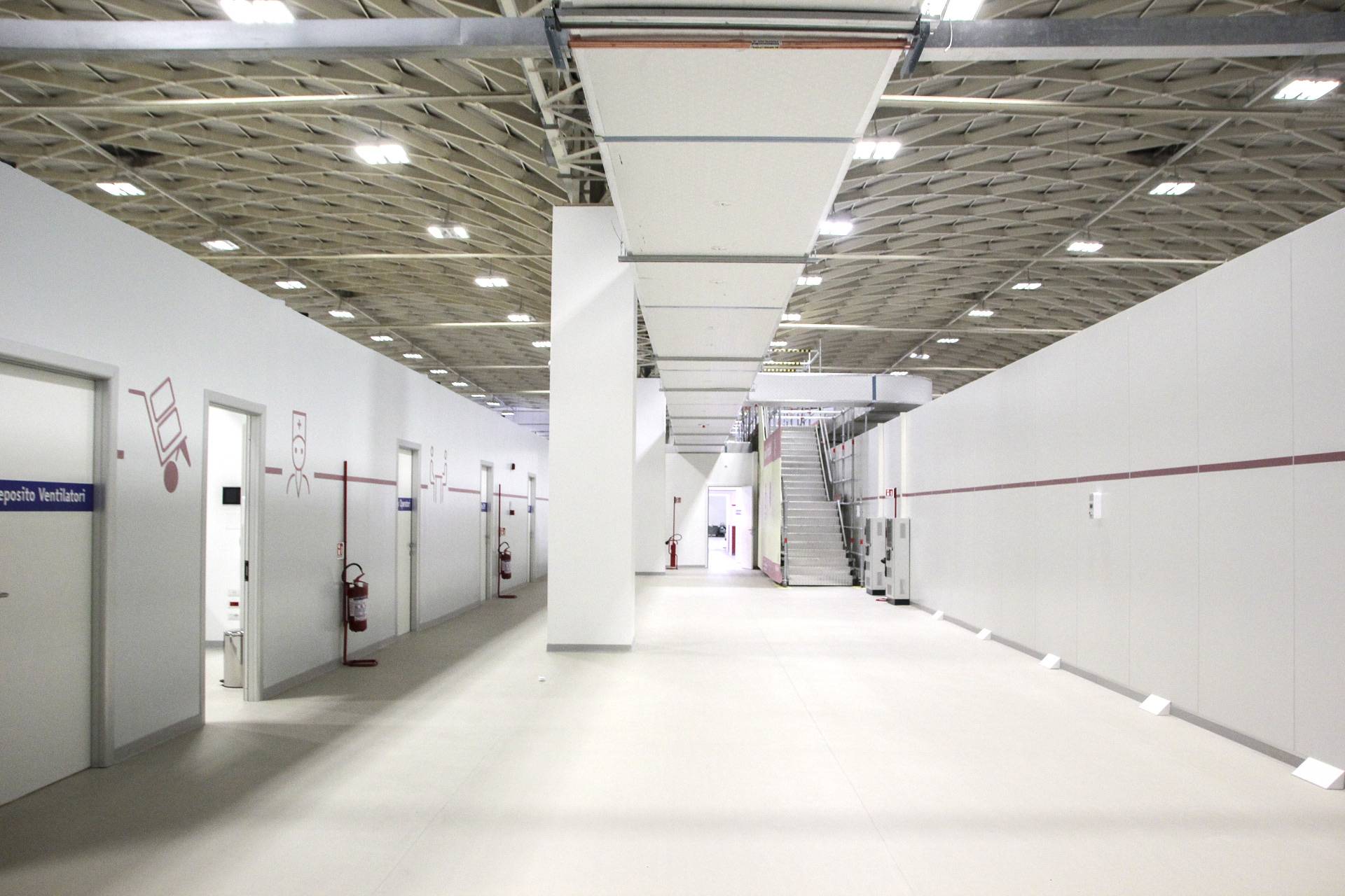 Ciò che caratterizza questo lavoro è proprio la rapidità di realizzazione. Riadattare un padiglione  del complesso fieristico ad ospedale ha richiesto attenti studi sulla viabilità, sui percorsi interni e sui materiali, soprattutto per minimizzare la possibilità di contagio. Si è intervenuto sugli accessi in ospedale, a partire dalla segnaletica stradale nei punti strategici della viabilità urbana ed extraurbana. Sono stati definiti e ben ubicati gli ingressi delle ambulanze e del personale medico, i parcheggi e le zone di carico e scarico merci. Per l’ingresso dei pazienti è prevista una “camera calda” nel Padiglione 13, costituita da una struttura prefabbricata rivestita in PVC, collegata all’area adibita a triage e a una zona diagnostica dotata di una sala TAC e una sala RX con apparecchi radiologici portatili.