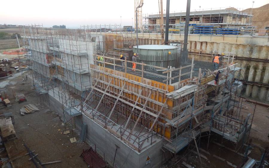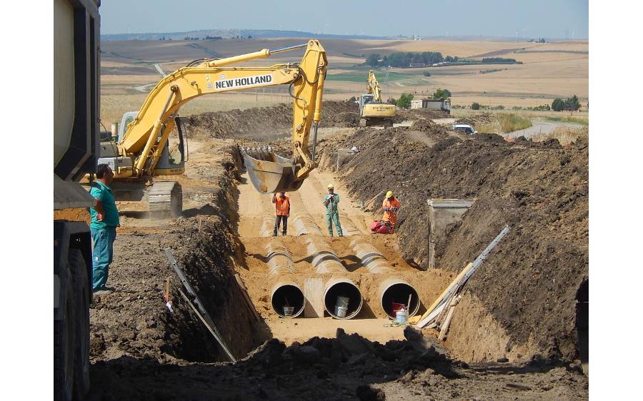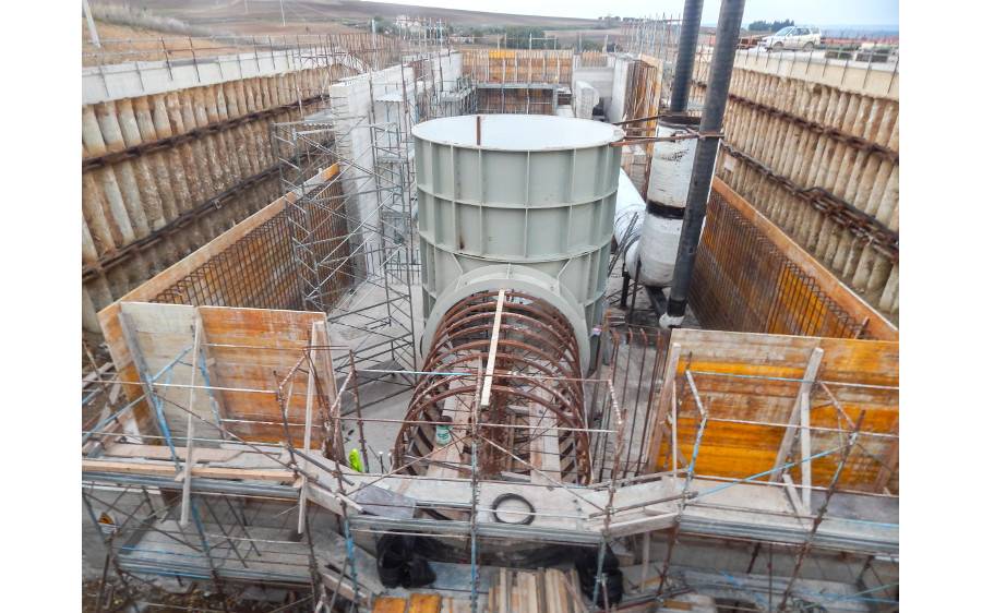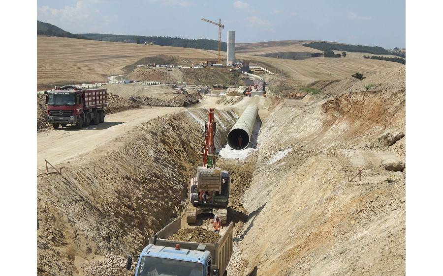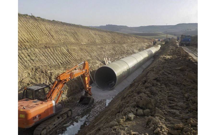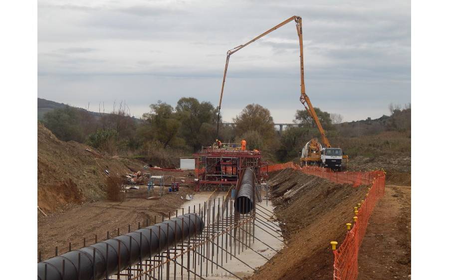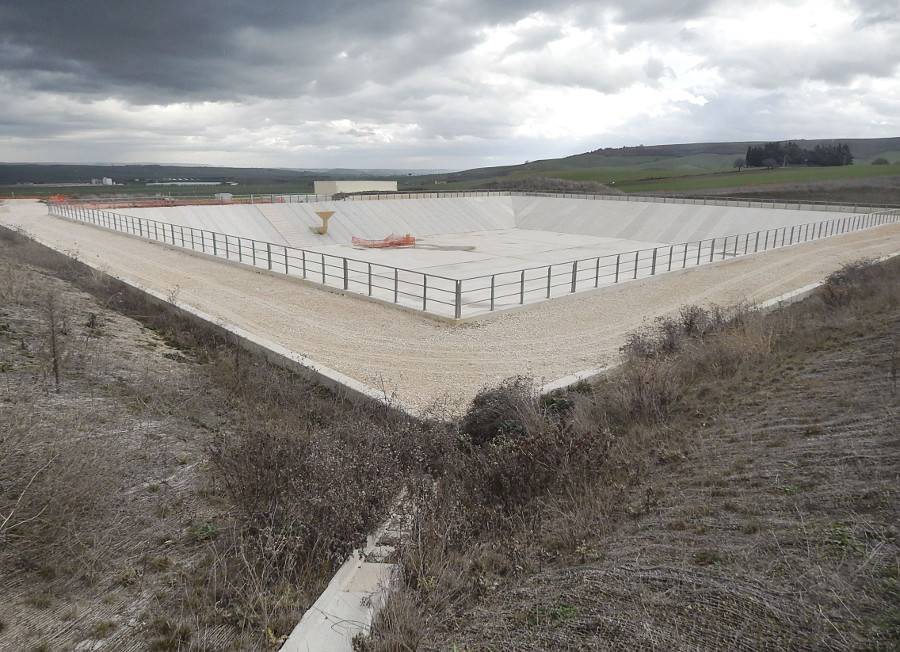 Da quest’ultimo hanno origine i tre adduttori che alimentano le tre vasche: B1, di 4,20 km (PRFV DN 800), B2, di 0,144 km (PRFV DN 600) e B3, di 7,20 km (PRFV DN 900). Le vasche, definite nel progetto V1/V2/V3, hanno rispettivamente la capienza di 15.000, 12.000 e 20.000mc. A servizio delle vasche V2/V3 saranno realizzati due impianti di sollevamento, rispettivamente di 900 lt/s e 1.600 lt/s. Dalle tre vasche partirà la rete di distribuzione di 1° livello realizzata con condotte in PRFV per un totale di 27 km, che andrà ad alimentare 17 comiziali.